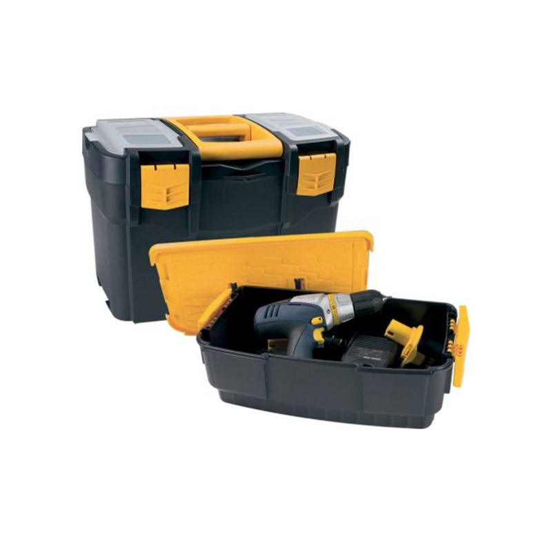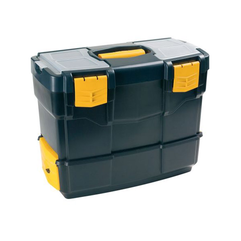 Ορθογώνια εργαλειοθήκη Ιταλικού σχεδιασμού και παραγωγής, κατασκευασμένη από πολυπροπυλένιο, ένα υλικό φιλικό προς το περιβάλλον και ανθεκτικό στην υπεριώδη ακτινοβολία UV και τις καιρικές συνθήκες. Πλένεται εύκολα, δε συγκρατεί υγρασία και οσμές ενώ είναι ανθεκτικό στην επαφή με έλαια και διαλύτες. Διαθέτει 2 ταμπακιέρες στην οροφή για αποθήκευση βιδών, κλειδιών, ούπα κ.α και εσωτερικό organizer το οποίο μπορεί να φιλοξενήσει μικρά εργαλεία χειρός όπως κατσαβίδια, μέτρο, μονωτική ταινία κ.α. Πρακτική, καθώς αφαιρώντας το organiser (ράφι) δημιουργείται αρκετός χώρος για αποθήκευση μικρών ηλεκτρικών εργαλείων ή εργαλείων χειρός όπως δράπανο, σφυρί, κάβουρας ενώ μπορείτε να ταξινομήσετε τα εργαλεία σας σε κατηγορίες χρησιμοποιώντας τον κάτω δεύτερο αποθηκευτικό χώρο ο οποίος μπορεί να αφαιρεθεί και να χρησιμοποιηθεί σαν δεύτερη ατομική εργαλειοθήκη. Κλείνει με 4 πλαστικά κλιπς ενώ υπάρχει δυνατότητα τοποθέτησης κλειδαριάς για μεγαλύτερη προστασία και στις δύο εργαλειοθήκες. Μεταφέρεται εύκολα χάρη στην πλαστική χειρολαβή που διαθέτει και γίνεται ο χρήσιμος βοηθός τόσο για επαγγελματική όσο και για οικιακή χρήση.