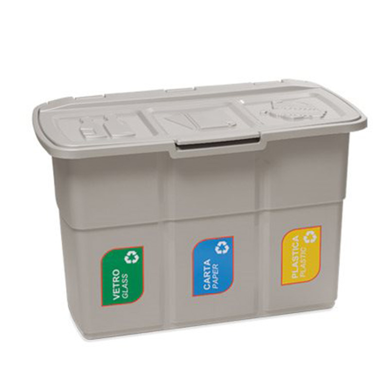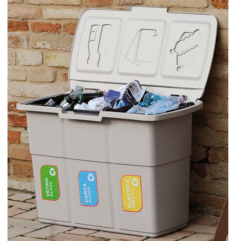 Σταθερός, χωρίς ολίσθηση, με κατηγοριοποιημένη ένδειξη στο εξωτερικό του αλλά και ανάγλυφες ενδείξεις στο ενιαίο, εύχρηστο καπάκι του για γυαλί, χαρτί και πλαστικό, αποτελεί καινοτόμα επιλογή ανακύκλωσης που απευθύνεται σε περιβαλλοντικά ευαισθητοποιημένους καταναλωτές και σε όσους θέλουν να ξεχωρίζουν.