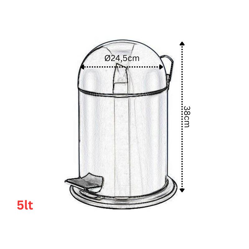 Δοχείο απορριμμάτων χωρητικότητας 5 λίτρων. Ο σκελετός του δοχείου είναι από μέταλλο INOX και πομπέ καπάκι κομψής κατασκευής. Διαθέτει σύστημα ανοίγματος με το πόδι (πεντάλ) και εσωτερικό δοχείο απορριμμάτων με χειρολαβης για μεγαλύτερη διευκόλυνση στη χρήση και στον καθαρισμό του περιεχομένου. Ιδανική λύση για μικρούς χώρους και WC καθώς καταλαμβάνει ελάχιστο χώρο.