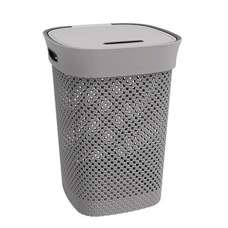 Καλάθι απλύτων σε τετράγωνο σχήμα, χωρητικότητας 50 λίτρων, Ιταλικού σχεδιασμού και παραγωγής, κατασκευασμένο από πλαστικό υψηλής αντοχής στο χρόνο και την καθημερινή χρήση σε γκρι χρώμα με ανθρακί λεπτομέρεια. Διαθέτει κομψό σχεδιασμό και ιδιαίτερη αισθητική (μάλλινο πλεκτό), λαβές στις δύο πλαϊνές πλευρές και στο καπάκι, προσφέροντας μια διαφορετική όψη στο μπάνιο ενώ συγχρόνως είναι πρακτικό και εύχρηστο καθώς τα ρούχα μέσα στο καλάθι αερίζονται.