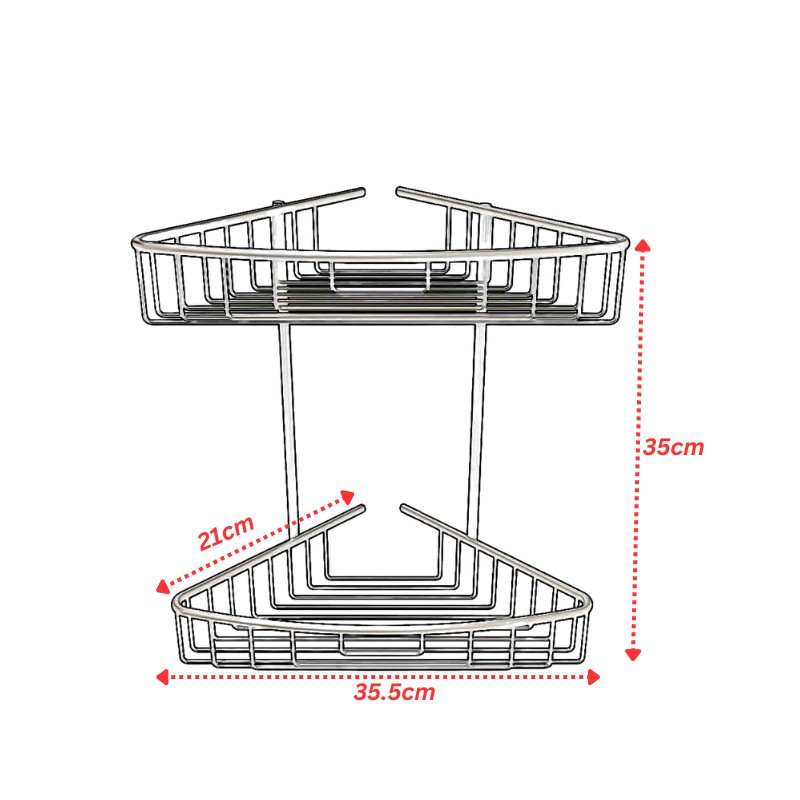 Γωνιακή εταζέρα μπάνιου κατασκευασμένη από αλουμίνιο, υλικό που δεν σκουριάζει στην επαφή με το νερό. Διαθέτει 2 ράφια για αφρόλουτρα, σαμπουάν, κρέμες κ.α και βάση αλουμινίου για σαπούνια.Τοποθετείται στον τοίχο με χρήση της EXTRA STRONG κόλλας που διαθέτει ή με βίδες (δεν περιλαμβάνονται). Παρέχονται αναλυτικές οδηγίες τοποθέτησης.