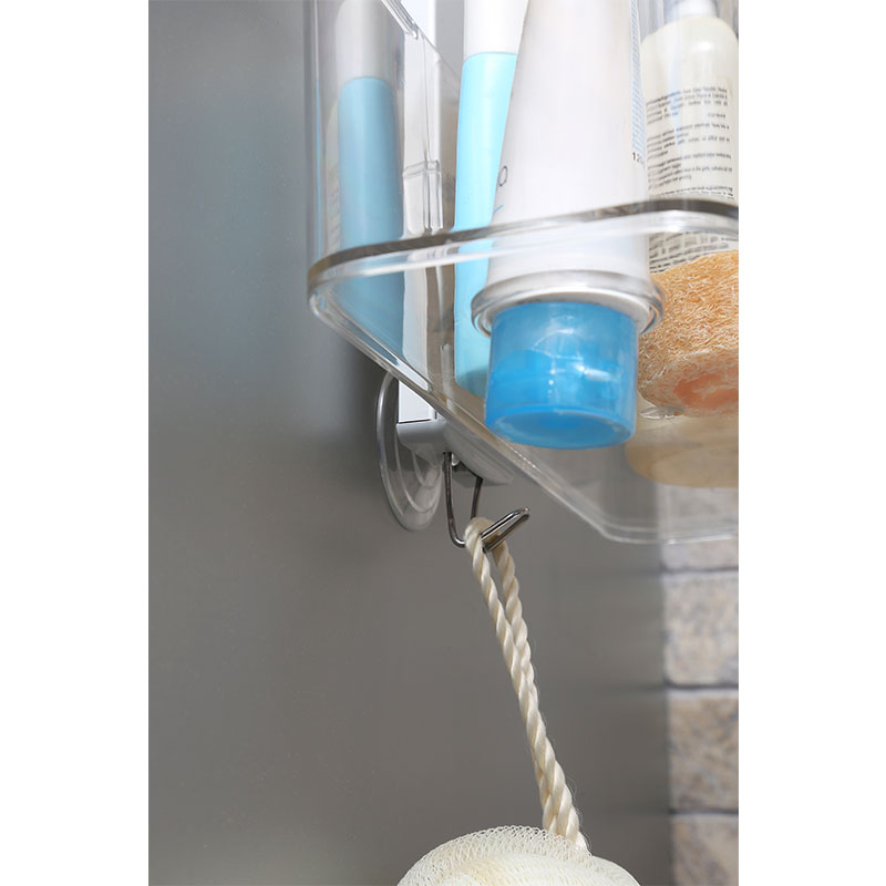 Εταζέρα μπάνιου κατασκευασμένη από αλουμίνιο με πλαστικά ράφια. Μπορεί να τοποθετηθεί με ασφάλεια στον τοίχο ή στο πάνελ της ντουζιέρας. Διαθέτει 2 πλαστικά διάφανα ράφια για αφρόλουτρα, σαμπουάν κ.α είδη υγιεινής. Κάθε ράφι διαθέτει 2 εσωτερικές οπές τοποθέτησης αφρόλουτρων, διευκολύνοντας τη χρήση ενώ υπάρχει και ενσωματωμένος γάντζος στο κάτω μέρος για σφουγγάρια. Τοποθετείται εξίσου αποτελεσματικά στο πάνελ της ντουζιέρας ή στον τοίχο με βεντούζα (περιλαμβάνεται).