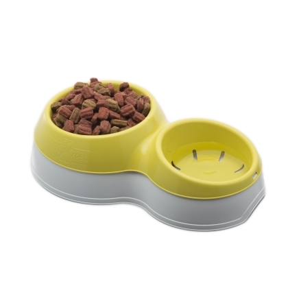 Διπλό μπολ φαγητού για κατοικίδια, κατασκευασμένο από πλαστικό υψηλής αντοχής στο χρόνο και την καθημερινή χρήση. Το πάνω μπολ είναι η κλασική ταϊστρα διαχωρισμού νερού-τροφής. Το μεγάλο του πλεονέκτημα σε σχέση με τα συνηθισμένα μπολ είναι η τοποθέτηση νερού στη βάση του, για να διατηρεί την τροφή σε κατάλληλα επίπεδα υγρασίας. Διαθέτει δύο πλαστικά κλιπς στις άκρες για να διευκολύνει τον χρήστη στον καθαρισμό και στην ανανέωση του νερού της βάσης καθώς και λαστιχένια πατάκια στον πάτο για μεγαλύτερη σταθερότητα.