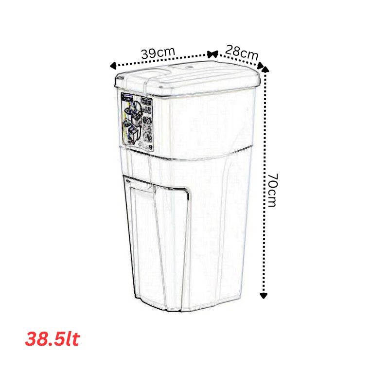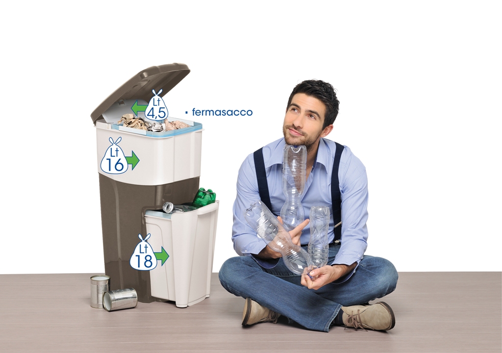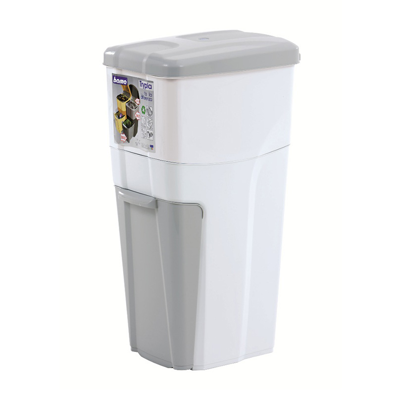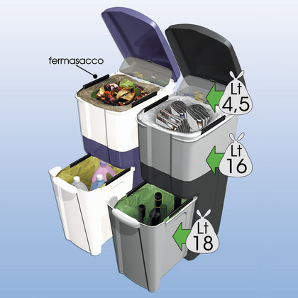 Πλαστικό δοχείο απορριμμάτων και ανακύκλωσης μεγάλης αντοχής, κατασκευασμένο από πλαστικό 100% ανακυκλώσιμο. Διαθέτει καινοτόμο σχεδιασμό, χωρίζοντας το δοχείο απορριμμάτων σε τρεις διαφορετικούς κάδους. Ένας κάδος χωρητικότητας 18 λίτρων για ανακυκλώσιμα υλικά (γυαλί, πλαστικό, χαρτί, αλουμίνιο), ένας κάδος χωρητικότητας 16 λίτρων για απορρίμματα φαγητών και έναν κάδο χωρητικότητας 4,5 λίτρων που λειτουργεί σαν αποθηκευτικός χώρος για τις σακούλες.
