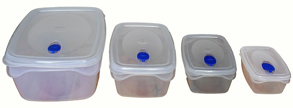 Ορθογώνια φαγητοδοχεία Ιταλικής παραγωγής, κατασκευασμένα από πλαστικό κατάλληλο για τρόφιμα σύμφωνα με τους ευρωπαϊκούς κανονισμούς. Ανθεκτικά στην καθημερινή χρήση και κατάλληλα για πλύσιμο στο πλυντήριο πιάτων αφού αντέχουν έως και τους 100°C. Χρησιμοποιούνται για την αποθήκευση των τροφίμων στο ψυγείο (συντήρηση - κατάψυξη) ενώ διαθέτουν ειδική βαλβίδα στο καπάκι για την απομάκρυνση του αέρα από το εσωτερικό τους. Πριν την τοποθέτηση τους στην κατάψυξη πατάμε στο κέντρο του καπακιού για να φύγει πρώτα ο αέρας και μετά κλείνουμε την βαλβίδα. Έτσι αποθηκεύεται το φαγητό σε συνθήκες κενού αέρος, αυξάνεται το χρονικό διάστημα διατήρησης και μειώνεται η πιθανότητα αλλοίωσης. Τοποθετούνται στο φούρνο μικροκυμάτων για ζέσταμα ή ξεπάγωμα των τροφίμων, με ανοιχτή τη βαλβίδα για την εισαγωγή νωπού αέρα. Το σετ αποτελείται από 4 τεμάχια διαφορετικών χωρητικοτήτων που μπορούν να αποθηκευτούν το ένα μέσα στο άλλο εξοικονομώντας χώρο στο ντουλάπι. Διατίθενται με διάφανο σκελετό για τον καλύτερο έλεγχο του περιεχομένου και με διάφανο ή χρωματιστό (2 χρώματα) καπάκι.