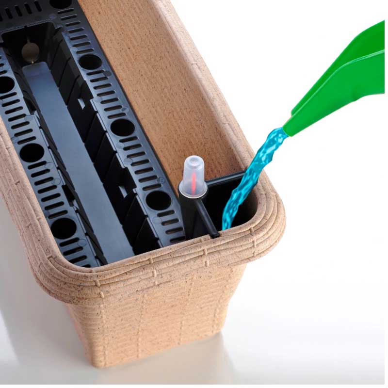 Πλαστική ζαρντινιέρα Ιταλικής παραγωγής, με κομψό σχεδιασμό σε απομίμηση ψάθας. Μεγάλο της πλεονέκτημα είναι ο σύγχρονος μηχανισμός ελέγχου της ποσότητας νερού, ο οποίος λειτουργεί σαν αυτόματο πότισμα δίνοντας στο φυτό την κατάλληλη ποσότητα νερού που χρειάζεται. Κατασκευασμένη από 100% ανακυκλώσιμο πλαστικό, ιδιαίτερα ανθεκτικό στην υπεριώδη ακτινοβολία UV και στις μεταβολές της θερμοκρασίας. Κατάλληλη για εξωτερικούς αλλά και εσωτερικούς χώρους.
