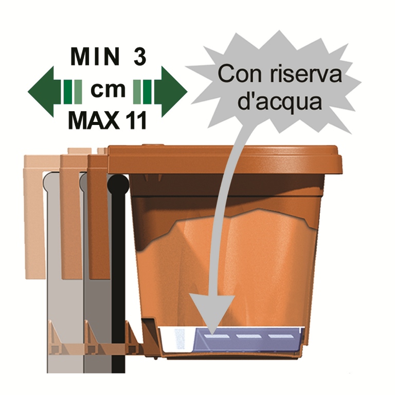 Ζαρντινιέρα Ιταλικής παραγωγής κατασκευασμένη από πλαστικό υψηλής αντοχής. Διαθέτει δύο ρυθμιζόμενους πλαστικούς βραχίονες με ανάπτυγμα από 3-11 εκατοστά, ώστε να εφαρμόζει κατάλληλα σε κάγκελα και κουπαστές διαφόρων διαστάσεων. Στην βάση της υπάρχει σύστημα αποστράγγισης που δεν επιτρέπει διαρροές ενώ ταυτόχρονα προμηθεύει στα φυτά την απαραίτητη υγρασία ώστε να αποφεύγεται το σάπισμα των ριζών. Κατασκευασμένη από 100% ανακυκλώσιμο πλαστικό, ιδιαίτερα ανθεκτικό στην υπεριώδη ακτινοβολία UV και στις μεταβολές της θερμοκρασίας. Κομψή και πρακτική, ομορφαίνει το μπαλκόνι, τη βεράντα, τον κήπο σας.