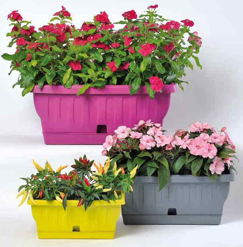 Πλαστική ζαρντινιέρα Ιταλικής παραγωγής, σε χρωματιστό decor με ενσωματωμένο πιάτο στη βάση της, το οποίο αποσπάται για να καθαριστεί. Κατασκευασμένη από 100% ανακυκλώσιμο πλαστικό, ιδιαίτερα ανθεκτικό στην υπεριώδη ακτινοβολία UV και στις μεταβολές της θερμοκρασίας. Διαθέτει σύστημα ποτίσματος απευθείας στο πιάτο. Κατάλληλη για εξωτερικούς και εσωτερικούς χώρους.
