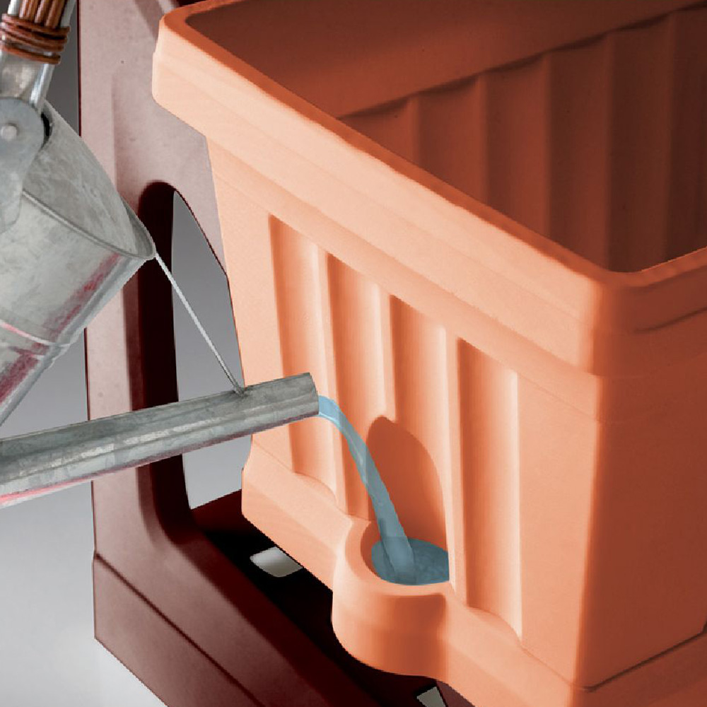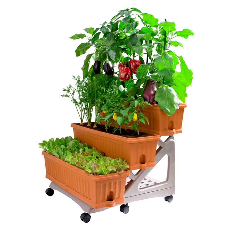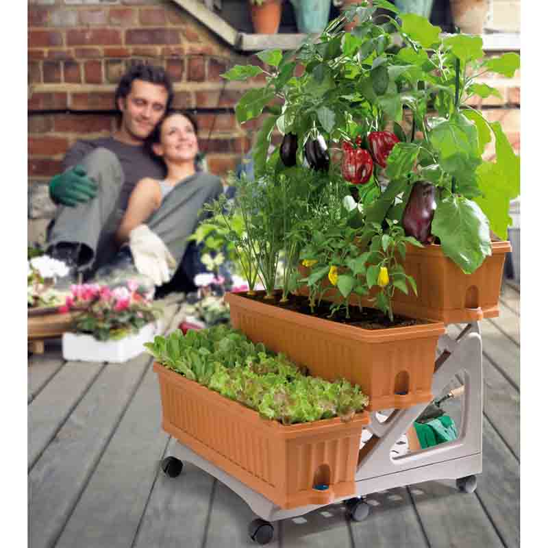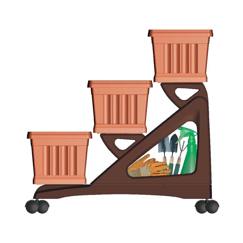 Πλαστική σκαλιέρα τριών επιπέδων Ιταλικής παραγωγής, ύψους 73 εκατοστών. Απόλυτα λειτουργικός σχεδιασμός, διευκολύνει την καθημερινή ενασχόλησή σας με τον κήπο λόγω των υπερυψωμένων επιπέδων, της δυνατότητας φύτευσης διαφορετικών φυτών και των 6 τροχών που διαθέτει. Παρέχει αποθηκευτικό χώρο για τα εργαλεία σας, 4 ράβδους και 3 ζαρντινιέρες χωρητικότητας 30 λίτρων συνολικά, οι οποίες ποτίζονται εύκολα από το πλάι και τοποθετούνται στο κάθε επίπεδο αντίστοιχα. Συναρμολογείται πανεύκολα χωρίς τη χρήση εργαλείων (περιλαμβάνει οδηγίες χρήσης).