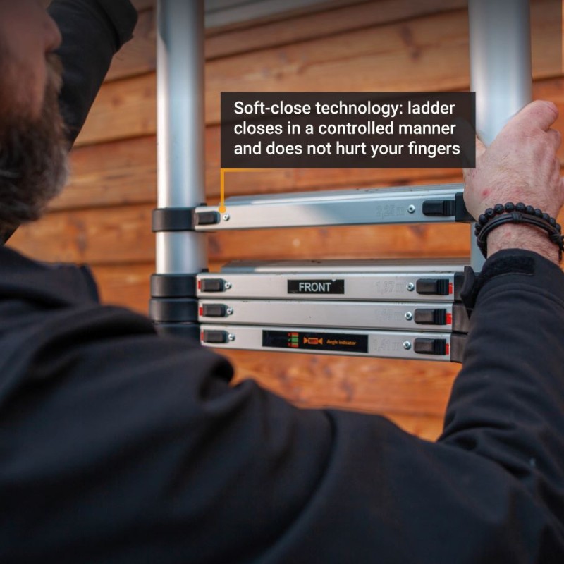 Επιπλέον, πάνω στη σκάλα υπάρχει ενσωματωμένος δείκτης κλίσης (angle indicator), ώστε να στήνεται πάντα στη σωστή γωνία για ασφαλή εργασία.