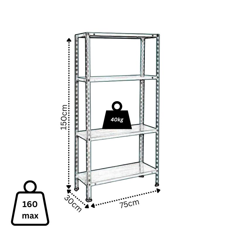 Μεταλλική ραφιέρα τύπου dexion με 4 σταθερά ράφια, κατασκευασμένη εξόλοκλήρου από γαλβανισμένο εν θερμώ χάλυβα για maximum αντοχές στις διαβρώσεις και την καθημερινή χρήση.