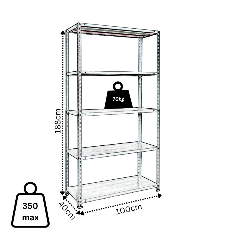 Μεταλλική ραφιέρα τύπου dexion με 5 σταθερά ράφια, κατασκευασμένη εξόλοκλήρου από γαλβανισμένο εν θερμώ χάλυβα για maximum αντοχές στις διαβρώσεις και την καθημερινή χρήση.