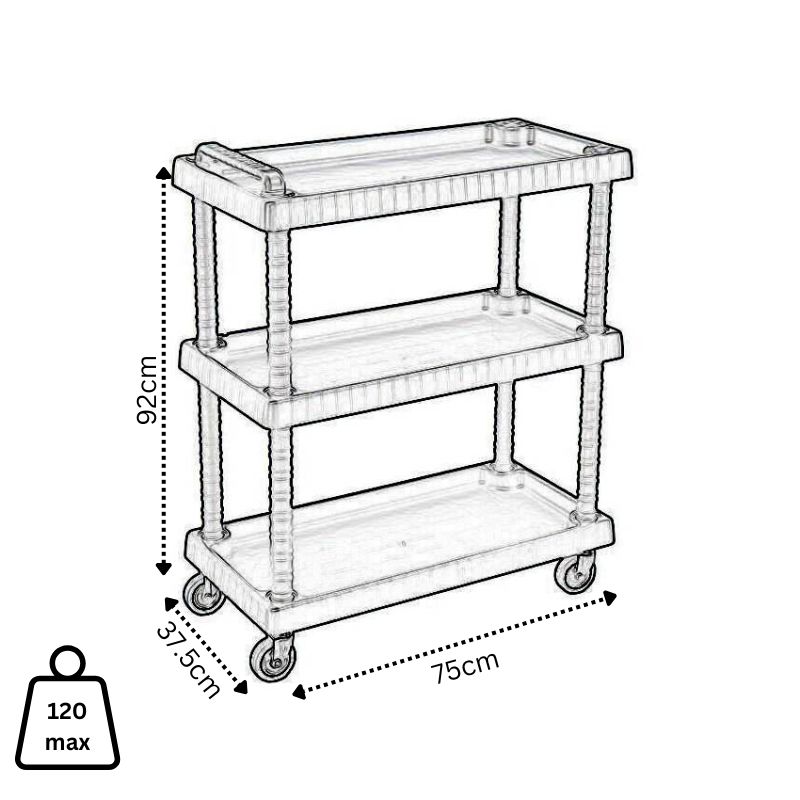 Πάγκος εργασίας με 3 ράφια, κατασκευασμένο εξ'ολοκλήρου από πολυπροπυλένιο, ένα υλικό ανακυκλώσιμο, φιλικό προς το περιβάλλον και ανθεκτικό στην υπεριώδη ακτινοβολία UV, στις οσμές και στην υγρασία (δεν χρειάζεται ιδιαίτερη φροντίδα και συντήρηση). Διαθέτει 3 ράφια για τοποθέτηση αντικειμένων και επιλογή ρύθμισης του μεσαίου ραφιού στο επιθυμητό ύψος. Μετακινείται εύκολα χάρη στις 4 ρόδες και την χειρολαβή που διαθέτει. Ιδανική επιλογή για οικιακές εργασίες όπως μαστορέματα όπου η χρήση πάγκου εργασίας είναι επιτακτική ανάγκη.