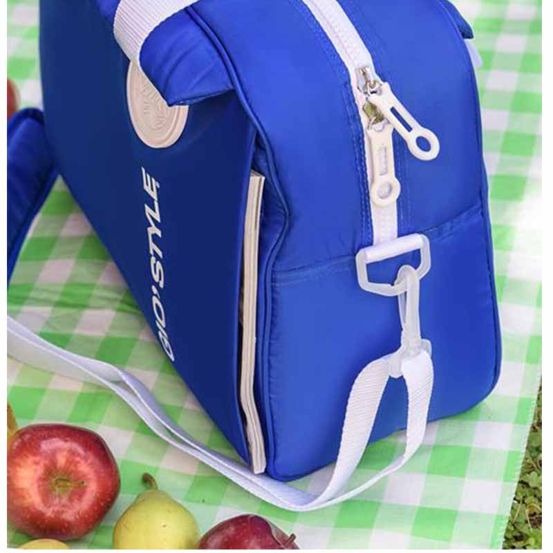 Ισοθερμική τσάντα Ιταλικού σχεδιασμού και χωρητικότητας 20 λίτρων (ή 27 κουτάκια των 330ml), κατασκευασμένη εξωτερικά από αδιάβροχο πολυεστέρα και εσωτερικά από πολυαιθυλένιο με ενισχυμένη μόνωση αφρολέξ 6mm για μεγαλύτερη προστασία του περιεχομένου. Διαθέτει φερμουάρ εύκολου ανοίγματος, αποθηκευτικό χώρο για περιοδικά και εφημερίδες, εσωτερικό πάνελ για διαχωρισμό των τροφίμων και ρυθμιζόμενο λουρί για μεγαλύτερη διευκόλυνση στη μεταφορά. Ιδανικός χώρος φύλαξης για τρόφιμα και ποτά καθώς τα διατηρεί δροσερά για 2-3 ώρες ενώ συνδυαζόμενη με παγοκύστες μπορεί να φτάσει έως και τις 12-13 ώρες. Χρήσιμο αξεσουάρ για την παραλία, τις εκδρομές, το camping, το σχολείο, τη δουλειά και για κάθε περίπτωση που απαιτείται μεταφορά φαγητών. Φέρει πιστοποιήσεις Azo FREE / Reach για την καταλληλότητα χρήσης σε τρόφιμα.