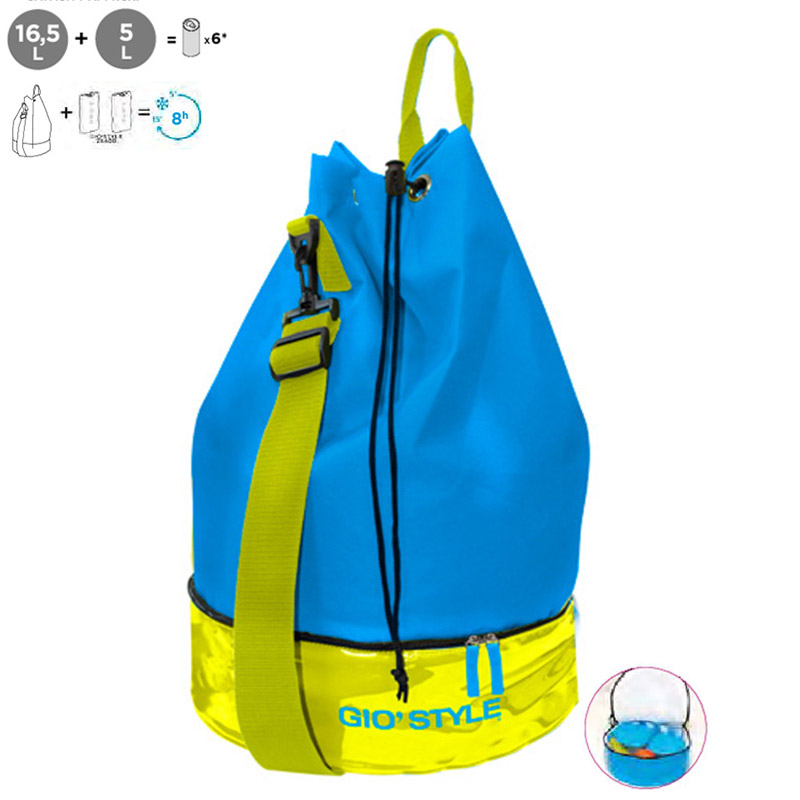 Σάκος ώμου χωρητικότητας 16.5 λίτρων με ισοθερμική βάση χωρητικότητας 5 λίτρων, κατασκευασμένο εξωτερικά από αδιάβροχο πολυεστέρα ενώ στο κάτω επίπεδο εσωτερικά είναι ενισχυμένη από πολυαιθυλένιο με ενισχυμένη μόνωση αφρολέξ 6mm για μεγαλύτερη διατήρηση της θερμοκρασίας. Διαθέτει 2 αποθηκευτικούς χώρους, έναν για ρούχα, πετσέτες, νεσεσέρ κ.α με σουρωτό μηχανισμό ανοίγματος και έναν αποθηκευτικό χώρο με φερμουάρ στη βάση για τρόφιμα, αναψυκτικά, νερά κ.α είδη που χρειάζονται διατήρηση της θερμοκρασίας. (ενδεικτικά μπορεί να διατηρήσει τη θερμοκρασία έως και 8 ώρες με χρήση 2 παγοκυστών) .Χρήσιμο αξεσουάρ για την παραλία, τις εκδρομές, το camping, το σχολείο, τη δουλειά και για κάθε περίπτωση που απαιτείται μεταφορά φαγητών.