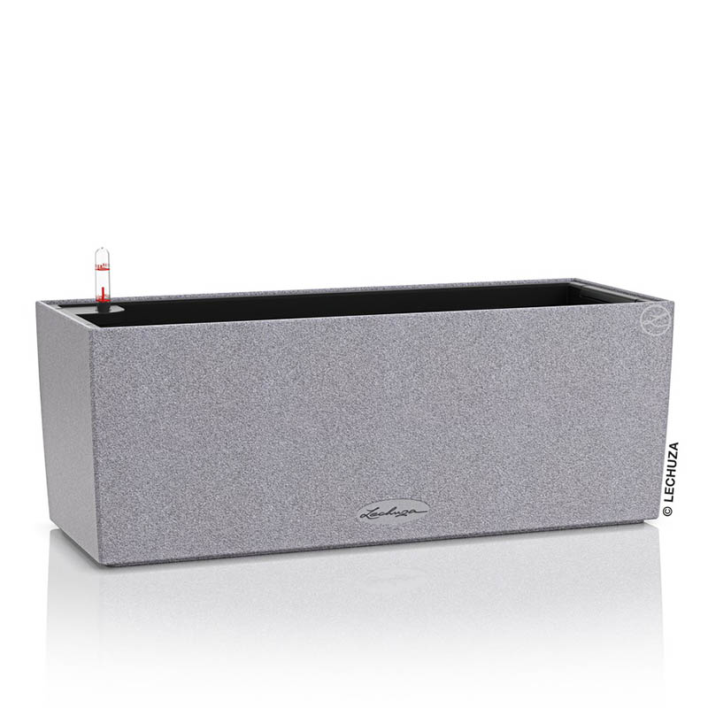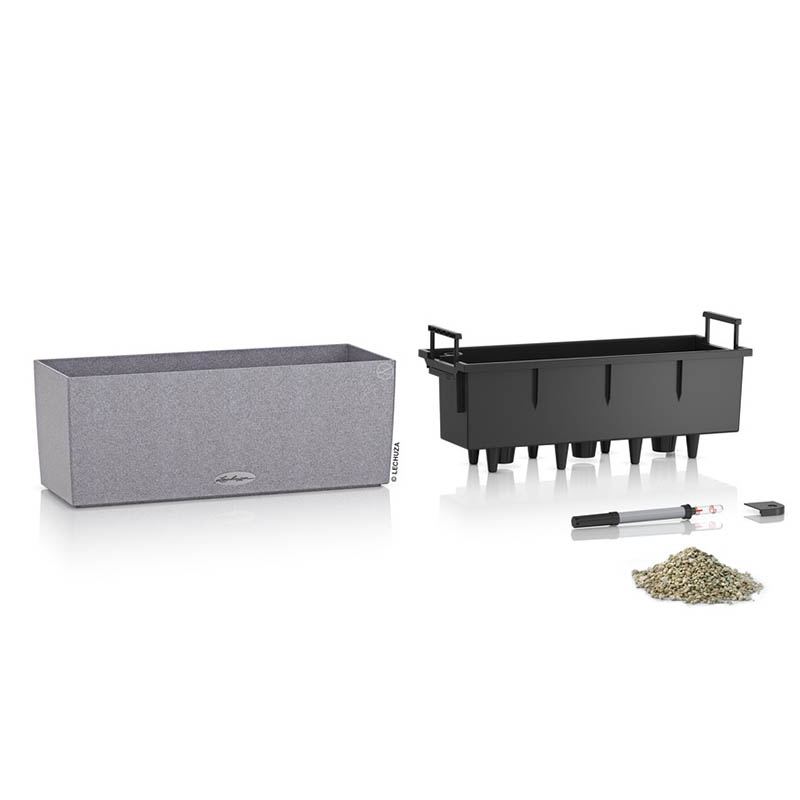Ζαρντινιέρα με κορυφαία ποιότητα κατασκευής και μοναδικό design (ανάγλυφη φυσική πέτρα γκρι χρώματος), Η συσκευασία περιλαμβάνει την ζαρντινιέρα, το εσωτερικό δοχείο φύτευσης, το σύστημα αυτοποτισμού, τον δείκτη νερού και το lechuza pon. Απόλυτα εργονομική χάρη στις βυθιζόμενες λαβές (με δίπλωμα ευρεσιτεχνίας), προσφέρει τη δυνατότητα για εύκολη αλλαγή των δοχείων φύτευσης διευκολύνοντας την αλλαγή φυτών, τη μεταφύτευση, το κλάδεμα των ριζών και το ξέπλυμα των φύλλων ενώ διαθέτει και βαλβίδα αποστράγγισης στον πάτο για να απορρέει το πλεονάζον νερό όταν τοποθετείται σε εξωτερικό χώρο ενώ το σύστημα αυτοποτισμού λειτουργεί ευεργετικά για το φυτό καθώς δίνει την απαραίτητη ποσότητα νερού που έχει ανάγκη το φυτό αλλά και για τον χρήστη, απαλλάσοντας τον από την καθημερινή φροντίδα του φυτού. Μπορεί να τοποθετηθεί πάνω σε οποιαδήποτε επιφάνεια, σε τραπέζι, πεζούλι, στο έδαφος αλλά και σε κάγκελα μπαλκονιού ή στον τοίχο σε συνδυασμό με τα άγκιστρα μπαλονιού LECHUZA. Το δοχείο φύτευσης έχει χωρητικότητα χώματος 8 και νερού 3 λίτρων και προσφέρει ιδανικό περιβάλλον για την ανάπτυξη φυτών με ύψος έως 30 και ριζικό σύστημα έως 12 εκατοστά. Πολύ ανθεκτική και ελαφριά κατασκευή, αντέχει στις ακραίες μεταβολές της θερμοκρασίας και την υπεριώδη ακτινοβολία UV. Αποτελεί εξαιρετική διακοσμητική επιλογή για τον κήπο, την αυλή, το σαλόνι κ.α απευθυνόμενη σε όσους θέλουν να ξεχωρίζουν συνδυάζοντας αρμονικά υψηλή αισθητική και λειτουργικότητα.