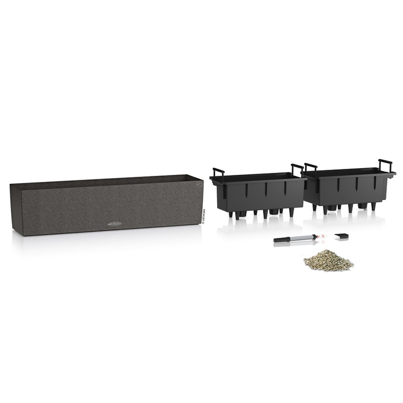 Ζαρντινιέρα με κορυφαία ποιότητα κατασκευής και μοναδικό design (ανάγλυφη φυσική πέτρα μαύρο γραφίτη χρώματος), Η συσκευασία περιλαμβάνει την ζαρντινιέρα, 2 εσωτερικά δοχεία φύτευσης, 2 σύστηματα αυτοποτισμού, 2 δείκτες νερού και το lechuza pon. Απόλυτα εργονομική χάρη στις βυθιζόμενες λαβές (με δίπλωμα ευρεσιτεχνίας), προσφέρει τη δυνατότητα για εύκολη αλλαγή των δοχείων φύτευσης διευκολύνοντας την αλλαγή φυτών, τη μεταφύτευση, το κλάδεμα των ριζών και το ξέπλυμα των φύλλων ενώ διαθέτει και βαλβίδα αποστράγγισης στον πάτο για να απορρέει το πλεονάζον νερό όταν τοποθετείται σε εξωτερικό χώρο ενώ το σύστημα αυτοποτισμού λειτουργεί ευεργετικά για το φυτό καθώς δίνει την απαραίτητη ποσότητα νερού που έχει ανάγκη το φυτό αλλά και για τον χρήστη, απαλλάσοντας τον από την καθημερινή φροντίδα του φυτού. Μπορεί να τοποθετηθεί πάνω σε οποιαδήποτε επιφάνεια, σε τραπέζι, πεζούλι, στο έδαφος αλλά και σε κάγκελα μπαλκονιού ή στον τοίχο σε συνδυασμό με τα άγκιστρα μπαλονιού LECHUZA. Το δοχείο φύτευσης έχει χωρητικότητα χώματος 12 και νερού 5 λίτρων και προσφέρει ιδανικό περιβάλλον για την ανάπτυξη φυτών με ύψος έως 30 και ριζικό σύστημα έως 12 εκατοστά. Πολύ ανθεκτική και ελαφριά κατασκευή, αντέχει στις ακραίες μεταβολές της θερμοκρασίας και την υπεριώδη ακτινοβολία UV. Αποτελεί εξαιρετική διακοσμητική επιλογή για τον κήπο, την αυλή, το σαλόνι κ.α απευθυνόμενη σε όσους θέλουν να ξεχωρίζουν συνδυάζοντας αρμονικά υψηλή αισθητική και λειτουργικότητα.
