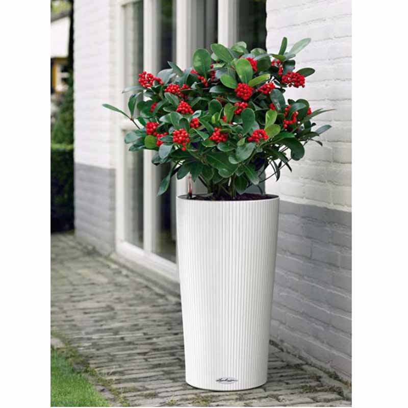 Επιδαπέδια γλάστρα με κορυφαία ποιότητα κατασκευής και μοναδικό σχεδιασμό λεπτόυ ριγέ design λευκού χρώματος. Η συσκευασία περιλαμβάνει τη γλάστρα, το εσωτερικό δοχείο φύτευσης, το σύστημα αυτοποτισμού και το lechuza-pon. Απόλυτα εργονομική χάρη στις βυθιζόμενες λαβές (με δίπλωμα ευρεσιτεχνίας), προσφέρει τη δυνατότητα για εύκολη αλλαγή των δοχείων φύτευσης διευκολύνοντας την αλλαγή φυτών, τη μεταφύτευση, το κλάδεμα των ριζών και το ξέπλυμα των φύλλων ενώ διαθέτει και διπλή βαλβίδα αποστράγγισης στη βάση του εσωτερικού δοχείου και της γλάστρας για να απορρέει το πλεονάζον νερό όταν τοποθετείται σε εξωτερικό χώρο προσφέροντας υγειές περιβάλλον στα φυτά ενώ το σύστημα αυτοποτισμού λειτουργεί ευεργετικά τόσο για το φυτό καθώς δίνει την απαραίτητη ποσότητα νερού στο φυτό όσο και για τον χρήστη, απαλλάσοντας τον από την καθημερινή φροντίδα του φυτού. Το δοχείο φύτευσης έχει χωρητικότητα χώματος 13lt και χωρητικότητα νερού 4lt και προσφέρει ιδανικό περιβάλλον για την ανάπτυξη φυτών με ύψος έως 60 και ριζικό σύστημα έως 23 εκατοστά. Η γλάστρα Lechuza Cilindro Color 32 αποτελεί μια εξαιρετική διακοσμητική επιλογή για εσωτερικούς και εξωτερικούς χώρους και για όσους θέλουν να ξεχωρίζουν συνδυάζοντας αρμονικά υψηλή αισθητική και λειτουργικότητα.