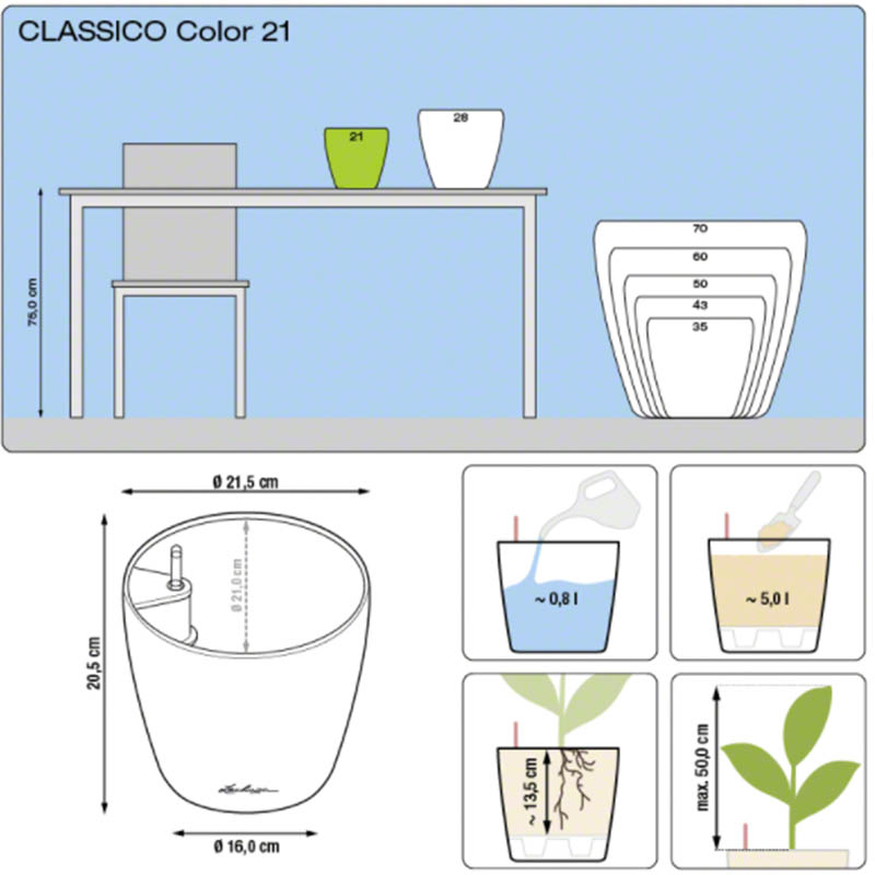 Στρογγυλή επιτραπέζια γλάστρα διαμέτρου Ø21.5 εκατοστών με κορυφαία ποιότητα κατασκευής και μοναδικό σχεδιασμό ανθρακί χρώματος. Η συσκευασία περιλαμβάνει τη γλάστρα, το σύστημα αυτοποτισμού και το lechuza-pon. Με λειτουργία υπερχείλισης και βαλβίδα αποστράγγισης στη βάση για να απορρέει το πλεονάζον νερό όταν τοποθετείται σε εξωτερικό χώρο, προσφέρει υγειές περιβάλλον στα φυτά ενώ το σύστημα αυτοποτισμού λειτουργεί ευεργετικά τόσο για το φυτό καθώς δίνει την απαραίτητη ποσότητα νερού στο φυτό όσο και για τον χρήστη, απαλλάσοντας τον από την καθημερινή φροντίδα του φυτού. Η γλάστρα έχει χωρητικότητα χώματος 5 και νερού 0,8 λίτρα και προσφέρει ιδανικό περιβάλλον για την ανάπτυξη φυτών με ύψος έως 50 και ριζικό σύστημα έως και 13,5 εκατοστά. Πολύ ανθεκτική και ελαφριά κατασκευή, αντέχει στις μεταβολές της θερμοκρασίας και την υπεριώδη ακτινοβολία UV. Η γλάστρα Classico 21 αποτελεί εξαιρετική επιλογή για το σπίτι ή και τον χώρο εργασίας, φωτίζοντας τον χώρο με την κλασσική της όψη.