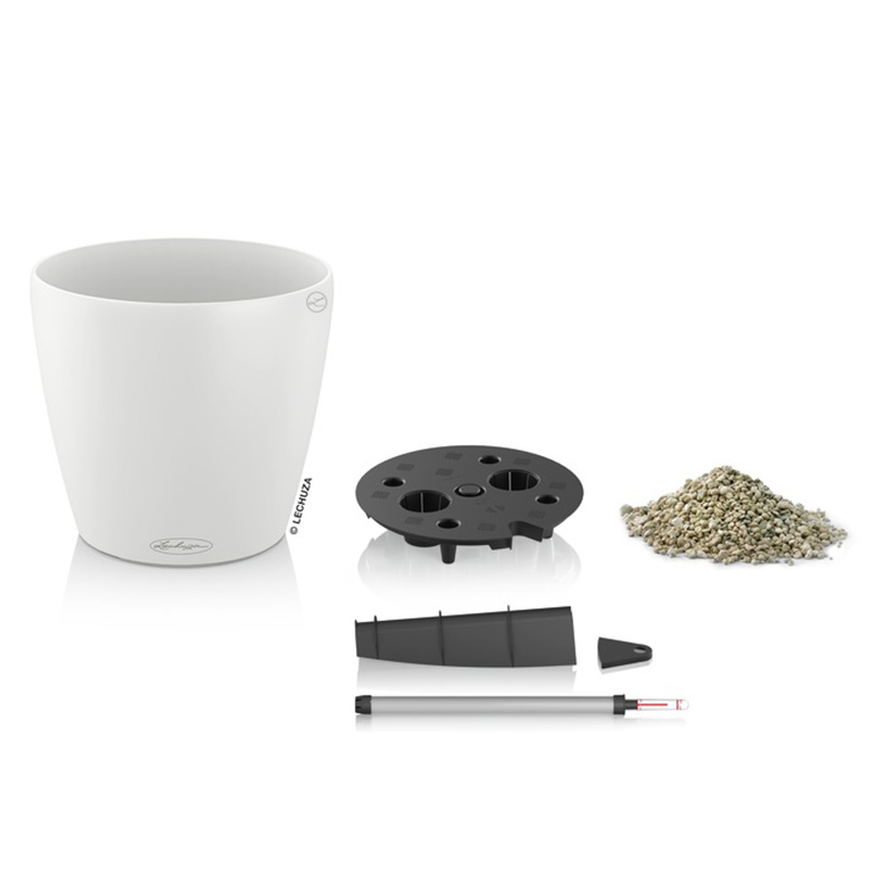 Στρογγυλή επιτραπέζια γλάστρα διαμέτρου Ø21.5 εκατοστών με κορυφαία ποιότητα κατασκευής και μοναδικό σχεδιασμό λευκού χρώματος. Η συσκευασία περιλαμβάνει τη γλάστρα, το σύστημα αυτοποτισμού και το lechuza-pon. Με λειτουργία υπερχείλισης και βαλβίδα αποστράγγισης στη βάση για να απορρέει το πλεονάζον νερό όταν τοποθετείται σε εξωτερικό χώρο, προσφέρει υγειές περιβάλλον στα φυτά ενώ το σύστημα αυτοποτισμού λειτουργεί ευεργετικά τόσο για το φυτό καθώς δίνει την απαραίτητη ποσότητα νερού στο φυτό όσο και για τον χρήστη, απαλλάσοντας τον από την καθημερινή φροντίδα του φυτού. Η γλάστρα έχει χωρητικότητα χώματος 5 και νερού 0,8 λίτρα και προσφέρει ιδανικό περιβάλλον για την ανάπτυξη φυτών με ύψος έως 50 και ριζικό σύστημα έως και 13,5 εκατοστά. Πολύ ανθεκτική και ελαφριά κατασκευή, αντέχει στις μεταβολές της θερμοκρασίας και την υπεριώδη ακτινοβολία UV. Η γλάστρα Classico 21 αποτελεί εξαιρετική επιλογή για το σπίτι ή και τον χώρο εργασίας, φωτίζοντας τον χώρο με την κλασσική της όψη.