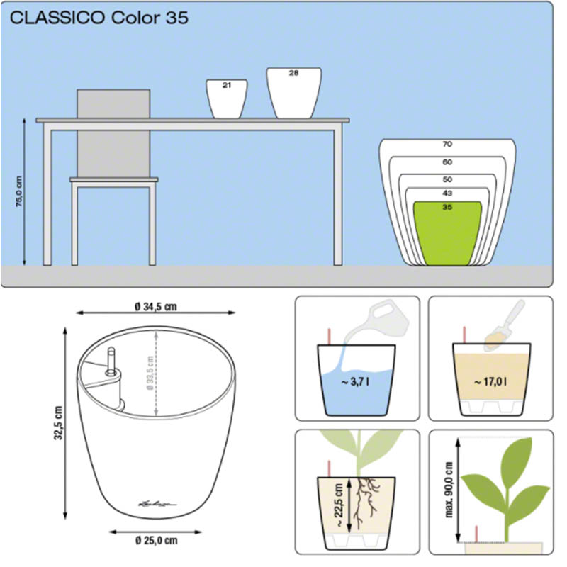 Το σύστημα αυτοποτισμού LECHUZA φροντίζει τα φυτά έως 12 εβδομάδες και εγγυάται τη λήψη της κατάλληλης ποσότητας νερού και θρεπτικών συστατικών για την άριστη ανάπτυξή τους.