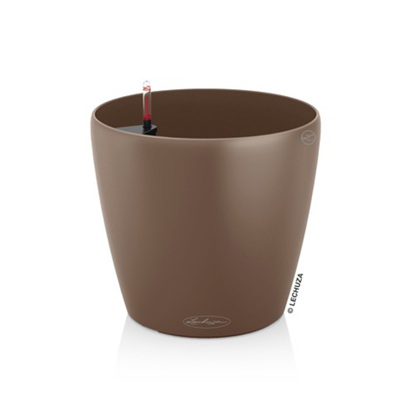 Στρογγυλή επιδαπέδια γλάστρα διαμέτρου Ø34.5 εκατοστών με κορυφαία ποιότητα κατασκευής και μοναδικό σχεδιασμό καρυδί χρώματος. Η συσκευασία περιλαμβάνει τη γλάστρα, το σύστημα αυτοποτισμού και το lechuza-pon. Με λειτουργία υπερχείλισης και βαλβίδα αποστράγγισης στη βάση για να απορρέει το πλεονάζον νερό όταν τοποθετείται σε εξωτερικό χώρο, προσφέρει υγειές περιβάλλον στα φυτά ενώ το σύστημα αυτοποτισμού λειτουργεί ευεργετικά τόσο για το φυτό καθώς δίνει την απαραίτητη ποσότητα νερού στο φυτό όσο και για τον χρήστη, απαλλάσοντας τον από την καθημερινή φροντίδα του φυτού. Η γλάστρα έχει χωρητικότητα χώματος 17 και νερού 3,7 λίτρα και προσφέρει ιδανικό περιβάλλον για την ανάπτυξη φυτών με ύψος έως 90 και ριζικό σύστημα έως και 22,5 εκατοστά. Πολύ ανθεκτική και ελαφριά κατασκευή, αντέχει στις μεταβολές της θερμοκρασίας και την υπεριώδη ακτινοβολία UV. Η γλάστρα Classico 35 αποτελεί εξαιρετική επιλογή για το σπίτι ή και τον χώρο εργασίας, φωτίζοντας τον χώρο με την κλασσική της όψη.