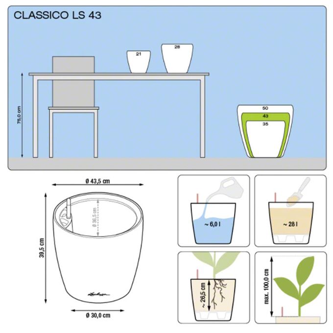Το σύστημα αυτοποτισμού LECHUZA φροντίζει τα φυτά έως 12 εβδομάδες και εγγυάται τη λήψη της κατάλληλης ποσότητας νερού και θρεπτικών συστατικών για την άριστη ανάπτυξή τους.