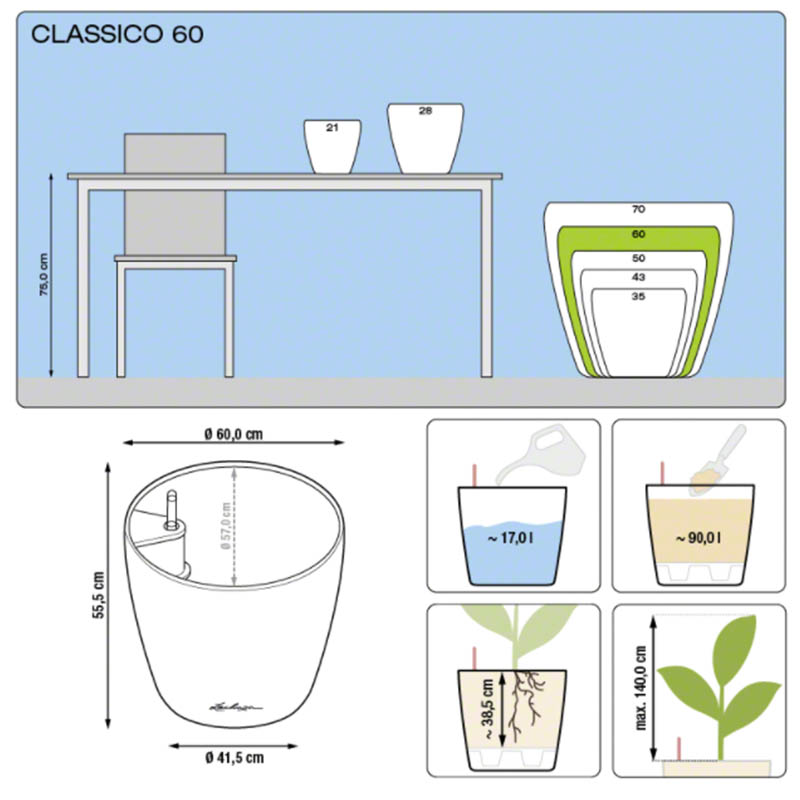 Το σύστημα αυτοποτισμού LECHUZA φροντίζει τα φυτά έως 12 εβδομάδες και εγγυάται τη λήψη της κατάλληλης ποσότητας νερού και θρεπτικών συστατικών για την άριστη ανάπτυξή τους.