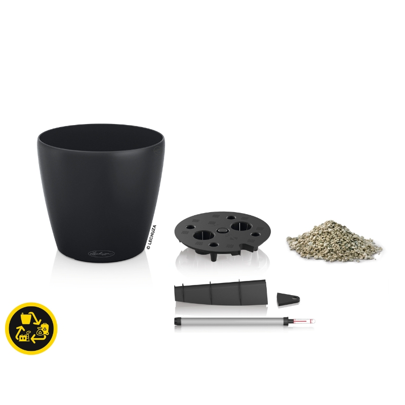 Η συσκευασία περιλαμβάνει τη γλάστρα, το σύστημα αυτοποτισμού και το lechuza-pon.