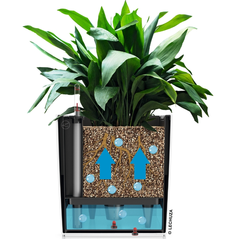 Το σύστημα αυτοποτισμού LECHUZA φροντίζει τα φυτά έως 12 εβδομάδες και εγγυάται τη λήψη της κατάλληλης ποσότητας νερού και θρεπτικών συστατικών για την άριστη ανάπτυξή τους.