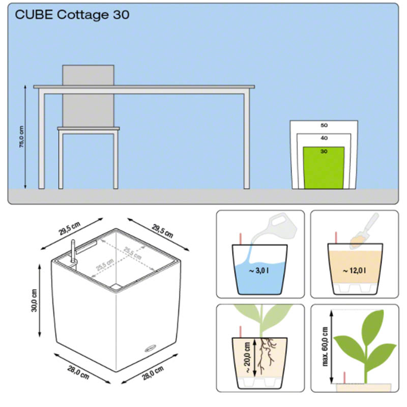 Το δοχείο φύτευσης έχει χωρητικότητα χώματος 12 και νερού 3 λίτρων και προσφέρει ιδανικό περιβάλλον για την ανάπτυξη φυτών με ύψος έως 60 και ριζικό σύστημα έως 20 εκατοστά.