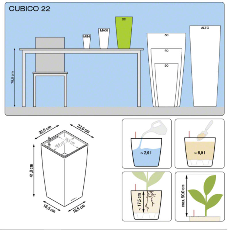 Επιτραπέζια γλάστρα με κορυφαία ποιότητα κατασκευής και μοναδικό σχεδιασμό σε μαύρο high-gloss χρώμα. Η συσκευασία περιλαμβάνει την γλάστρα, το εσωτερικό δοχείο φύτευσης, το σύστημα αυτόματου ποτίσματος και το lechuza-pon. Απόλυτα εργονομική χάρη στις βυθιζόμενες λαβές (με δίπλωμα ευρεσιτεχνίας), προσφέρει τη δυνατότητα για εύκολη αλλαγή των δοχείων φύτευσης διευκολύνοντας την αλλαγή φυτών, τη μεταφύτευση, το κλάδεμα των ριζών και το ξέπλυμα των φύλλων ενώ διαθέτει και διπλή βαλβίδα αποστράγγισης στη βάση του εσωτερικού δοχείου και της γλάστρας αντίστοιχα για να απορρέει το πλεονάζον νερό όταν τοποθετείται σε εξωτερικό χώρο. Το σύστημα αυτόματου ποτίσματος λειτουργεί ευεργετικά για το φυτό καθώς του παρέχει την απαραίτητη ποσότητα νερού που χρειάζεται ενώ είναι εξίσου ωφέλιμο και για τον χρήστη καθώς τον απαλλάσσει τον από την καθημερινή ευθύνη φροντίδας του φυτού. Το δοχείο φύτευσης έχει χωρητικότητα χώματος 6 και νερού 2 λίτρων και προσφέρει ιδανικό περιβάλλον για την ανάπτυξη φυτών με ύψος έως 50 και ριζικό σύστημα έως 17,5 εκατοστά. Πολύ ανθεκτική και ελαφριά κατασκευή, αντέχει στις μεταβολές της θερμοκρασίας και την υπεριώδη ακτινοβολία UV. Η γλάστρα LECHUZA Cubico 22 αποτελεί εξαιρετική διακοσμητική επιλογή για το σπίτι, τον επαγγελματικό χώρο, μαγαζιά εστίασης κ.α καθώς διαθέτει στοιχεία υψηλής αισθητικής, κομψού design αλλα και λειτουργικότητας.