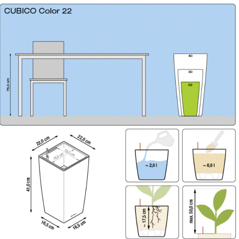 Επιδαπέδια γλάστρα Γερμανικής προέλευσης με κορυφαία ποιότητα κατασκευής και μοναδικό σχεδιασμό σε σατινέ ματ υφή ανθρακί χρώματος. Η συσκευασία περιλαμβάνει τη γλάστρα, το σύστημα αυτοποτισμού, το εσωτερικό δοχείο φύτευσης και το lechuza-pon. Απόλυτα εργονομική χάρη στις βυθιζόμενες λαβές (με δίπλωμα ευρεσιτεχνίας), προσφέρει τη δυνατότητα για εύκολη αλλαγή των δοχείων φύτευσης διευκολύνοντας την αλλαγή φυτών, τη μεταφύτευση, το κλάδεμα των ριζών και το ξέπλυμα των φύλλων ενώ διαθέτει και διπλή βαλβίδα αποστράγγισης στον πάτο για να απορρέει το πλεονάζον νερό όταν τοποθετείται σε εξωτερικό χώρο προσφέροντας υγειές περιβάλλον στα φυτά ενώ το σύστημα αυτοποτισμού λειτουργεί ευεργετικά για το φυτό καθώς παρέχει την απαραίτητη ποσότητα νερού που χρειάζεται αλλά και για τον χρήστη, απαλλάσοντας τον από την καθημερινή φροντίδα του φυτού. Το δοχείο φύτευσης έχει χωρητικότητα χώματος 6 και νερού 2 λίτρων και προσφέρει ιδανικό περιβάλλον για την ανάπτυξη φυτών με ύψος έως 50 και ριζικό σύστημα έως 17,5 εκατοστά. Πολύ ανθεκτική και ελαφριά κατασκευή, αντέχει στις μεταβολές της θερμοκρασίας και την υπεριώδη ακτινοβολία UV. Η γλάστρα LECHUZA Cubico 22 αποτελεί μια εξαιρετική επιλογή για όσους θέλουν να ξεχωρίζουν συνδυάζοντας αρμονικά υψηλή αισθητική και λειτουργικότητα.