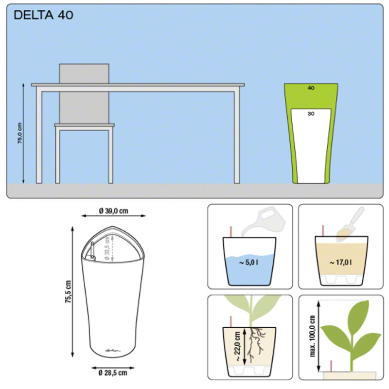 Επιδαπέδια γλάστρα με κορυφαία ποιότητα κατασκευής και μοναδικό καμπυλωτό σχεδιασμό σε ανθρακί σατινέ χρώμα. Η συσκευασία περιλαμβάνει τη γλάστρα, το εσωτερικό δοχείο φύτευσης, το σύστημα αυτοποτισμού και το lechuza pon. Απόλυτα εργονομική χάρη στη βυθιζόμενη περιμετρική λαβή (με δίπλωμα ευρεσιτεχνίας) προσφέρει τη δυνατότητα για εύκολη αλλαγή των δοχείων φύτευσης διευκολύνοντας την αλλαγή φυτών, τη μεταφύτευση, το κλάδεμα των ριζών και το ξέπλυμα των φύλλων ενώ διαθέτει και βαλβίδα αποστράγγισης στη βάση της γλάστρας για να απορρέει το πλεονάζον νερό όταν τοποθετείται σε εξωτερικό χώρο.Το σύστημα αυτοποτισμού λειτουργεί ευεργετικά για το φυτό καθώς του παρέχει την απαραίτητη ποσότητα νερού που χρειάζεται ενώ είναι εξίσου ωφέλιμο και για τον χρήστη καθώς τον απαλλάσσει από την καθημερινή ευθύνη φροντίδας του φυτού. Το δοχείο φύτευσης έχει χωρητικότητα χώματος 17 και νερού 5 λίτρων και προσφέρει ιδανικό περιβάλλον για την ανάπτυξη φυτών με ύψος έως 100 και ριζικό σύστημα έως 22 εκατοστά. Πολύ ανθεκτική και ελαφριά κατασκευή, αντέχει στις μεταβολές της θερμοκρασίας και την υπεριώδη ακτινοβολία UV. Η καμπυλωτή γραμμή της σειράς Delta σε σχήμα στήλης που καταλήγει σε ένα κομψό, σμιλεμένο τρίγωνο αποτελεί αποδεδειγμένα την απόλυτη διακοσμητική επιλογή για δημόσιους χώρους, ξενοδοχεία κ.α προσδίδοντάς τους ένα ιδιαίτερο ύφος που προσελκύει τα βλέμματα.