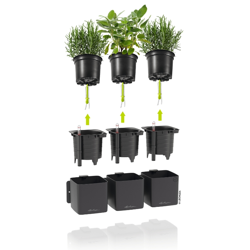 Η σύνθεση περιλαμβάνει τρεις γλάστρες με ενσωματωμένο σύστημα αυτοποτισμού, τρία μαγνητικά στηρίγματα, μεταλλική ράβδο και όλα τα απαραίτητα εξαρτήματα τοποθέτησης. Το έξυπνο design σου επιτρέπει να τοποθετήσεις απευθείας τα φυτά μαζί με το γλαστράκι φυτωρίου, αποφεύγοντας τη μεταφύτευση, απλώς προσαρμόζεις το φιτίλι και είναι έτοιμα.