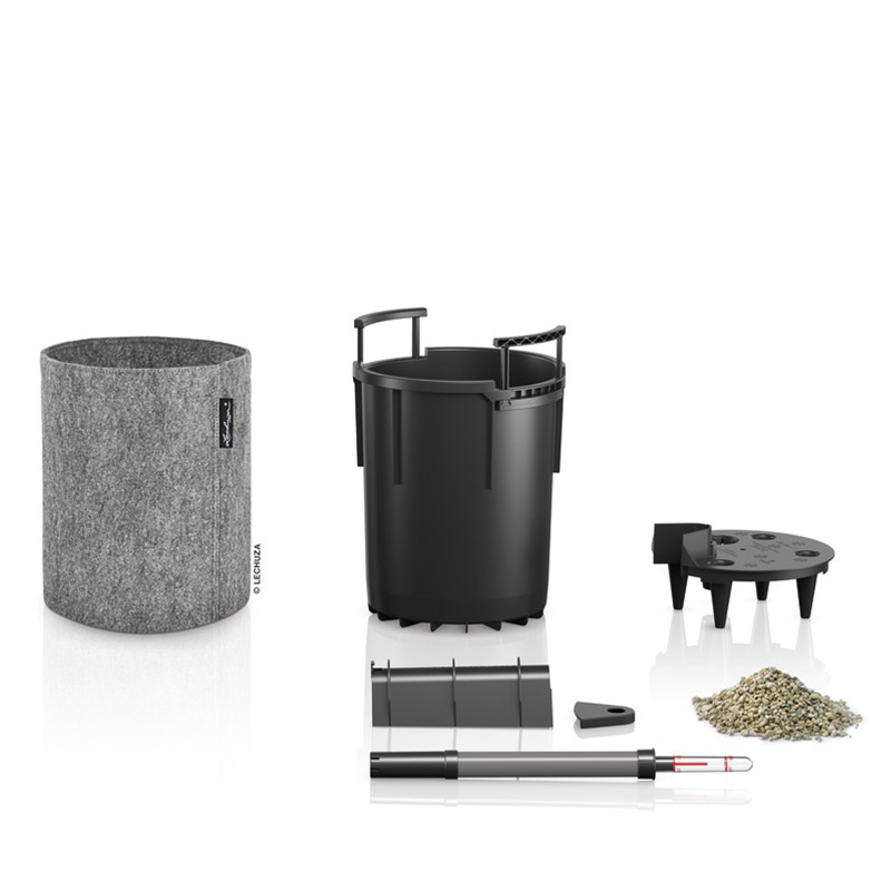 Η συσκευασία περιλαμβάνει τη γλάστρα, το εσωτερικό δοχείο φύτευσης, το σύστημα αυτοποτισμού και το lechuza-pon.