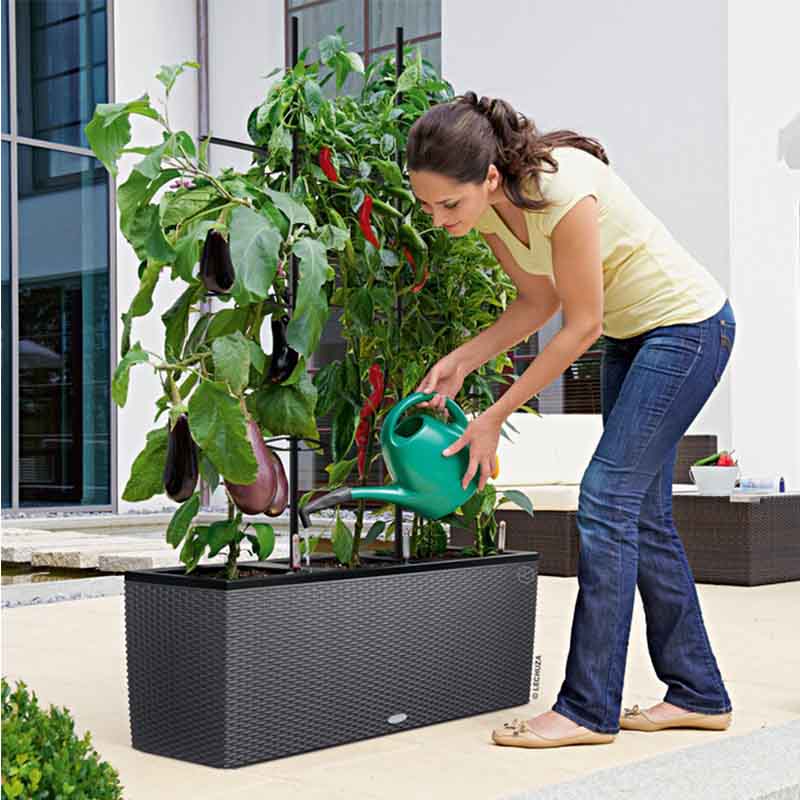 Επιδαπέδια ζαρντινιέρα με κορυφαία ποιότητα κατασκευής και μοναδικό σχεδιασμό σε ανθρακί rattan χρώμα. Η συσκευασία περιλαμβάνει την ζαρντινιέρα, 3 εσωτερικά δοχεία φύτευσης, 3 συστήματα αυτοποτισμού και 3 σακουλάκια lechuza pon. Απόλυτα εργονομική χάρη στις βυθιζόμενες λαβές (με δίπλωμα ευρεσιτεχνίας) που διαθέτει το κάθε δοχείο φύτευσης, προσφέρει τη δυνατότητα για εύκολη αλλαγή των δοχείων φύτευσης διευκολύνοντας την αλλαγή φυτών και λαχανικών, τη μεταφύτευση, το κλάδεμα των ριζών και το ξέπλυμα των φύλλων ενώ στη διαθέτει και 4 βαλβίδες αποστράγγισης (3 στις βάσεις των εσωτερικών δοχείων φύτευσης και 1 στη βάση της ζαρντινιέρας) για να απορρέει το πλεονάζον νερό όταν τοποθετείται σε εξωτερικό χώρο. Το σύστημα αυτοποτισμού λειτουργεί ευεργετικά για το φυτό καθώς του παρέχει την απαραίτητη ποσότητα νερού που χρειάζεται ενώ είναι εξίσου ωφέλιμο και για τον χρήστη καθώς τον απαλλάσσει από την καθημερινή ευθύνη φροντίδας του φυτού. Κάθε δοχείο φύτευσης έχει χωρητικότητα χώματος 14 λίτρα και χωρητικότητα νερού 4 λίτρα και προσφέρει ιδανικό περιβάλλον για την ανάπτυξη φυτών με ύψος έως 80cm και με ριζικό σύστημα έως 23cm. Πολυ ανθεκτική και ελαφριά κατασκευή (για τις δυνατότητες που προσφέρει), αντέχει στις μεταβολές της θερμοκρασίας και την υπεριώδη ακτινοβολία UV. Υπάρχει δυνατότητα τοποθέτησης ορθογώνιας βάσης LECHUZA.(Νο1 Μέγεθος) για ακόμη μεγαλύτερη ευστάθεια και ισορροπία ενώ το ειδικό πλέγμα αναρρίχησης LECHUZA (Νο1 Μέγεθος) δημιουργεί μια φανταστική πέργολα, ικανή να δημιουργήσει μοναδικές διακοσμητικές συνθέσεις και να κοσμήσει κάθε εξωτερικό χώρο.