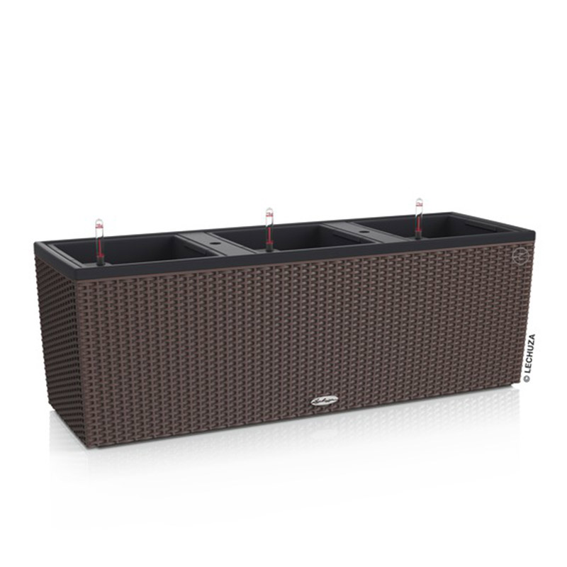 Επιδαπέδια ζαρντινιέρα με κορυφαία ποιότητα κατασκευής και μοναδικό σχεδιασμό σε καφέ rattan χρώμα. Η συσκευασία περιλαμβάνει την ζαρντινιέρα, 3 εσωτερικά δοχεία φύτευσης, 3 συστήματα αυτοποτισμού και 3 σακουλάκια lechuza pon. Απόλυτα εργονομική χάρη στις βυθιζόμενες λαβές (με δίπλωμα ευρεσιτεχνίας) που διαθέτει το κάθε δοχείο φύτευσης, προσφέρει τη δυνατότητα για εύκολη αλλαγή των δοχείων φύτευσης διευκολύνοντας την αλλαγή φυτών και λαχανικών, τη μεταφύτευση, το κλάδεμα των ριζών και το ξέπλυμα των φύλλων ενώ στη διαθέτει και 4 βαλβίδες αποστράγγισης (3 στις βάσεις των εσωτερικών δοχείων φύτευσης και 1 στη βάση της ζαρντινιέρας) για να απορρέει το πλεονάζον νερό όταν τοποθετείται σε εξωτερικό χώρο. Το σύστημα αυτοποτισμού λειτουργεί ευεργετικά για το φυτό καθώς του παρέχει την απαραίτητη ποσότητα νερού που χρειάζεται ενώ είναι εξίσου ωφέλιμο και για τον χρήστη καθώς τον απαλλάσσει από την καθημερινή ευθύνη φροντίδας του φυτού. Κάθε δοχείο φύτευσης έχει χωρητικότητα χώματος 14 λίτρα και χωρητικότητα νερού 4 λίτρα και προσφέρει ιδανικό περιβάλλον για την ανάπτυξη φυτών με ύψος έως 80cm και με ριζικό σύστημα έως 23cm. Πολυ ανθεκτική και ελαφριά κατασκευή (για τις δυνατότητες που προσφέρει), αντέχει στις μεταβολές της θερμοκρασίας και την υπεριώδη ακτινοβολία UV. Υπάρχει δυνατότητα τοποθέτησης ορθογώνιας βάσης LECHUZA.(Νο1 Μέγεθος) για ακόμη μεγαλύτερη ευστάθεια και ισορροπία ενώ το ειδικό πλέγμα αναρρίχησης LECHUZA (Νο1 Μέγεθος) δημιουργεί μια φανταστική πέργολα, ικανή να δημιουργήσει μοναδικές διακοσμητικές συνθέσεις και να κοσμήσει κάθε εξωτερικό χώρο.