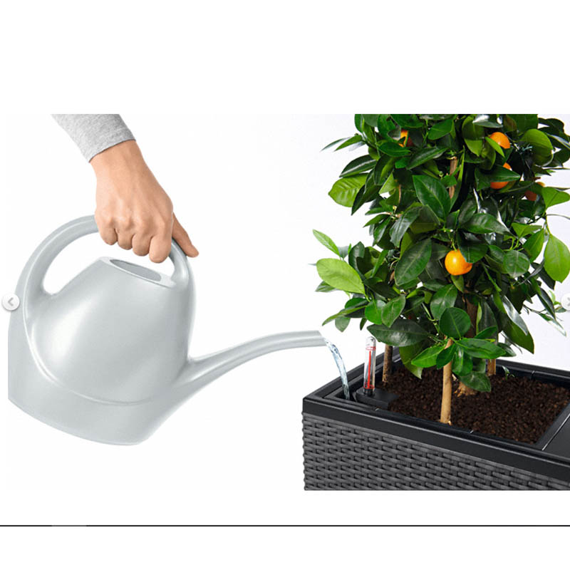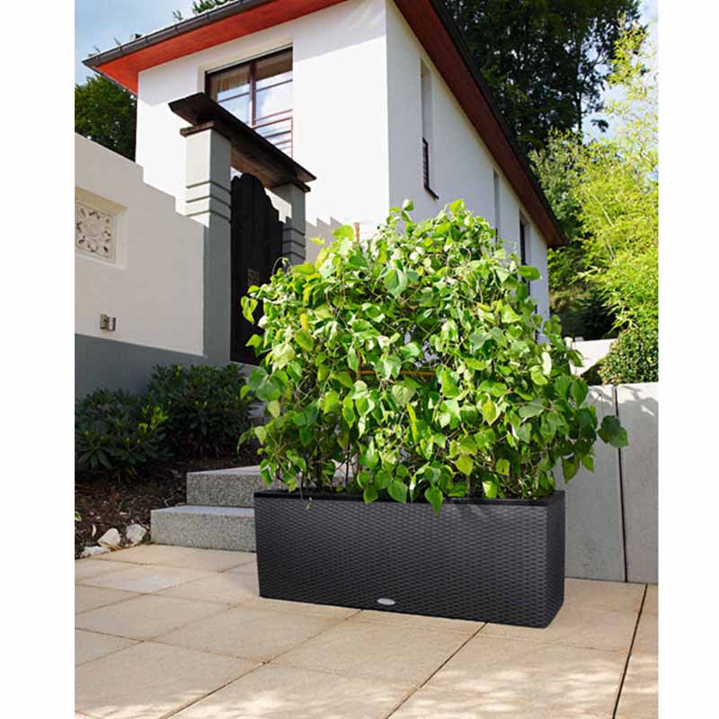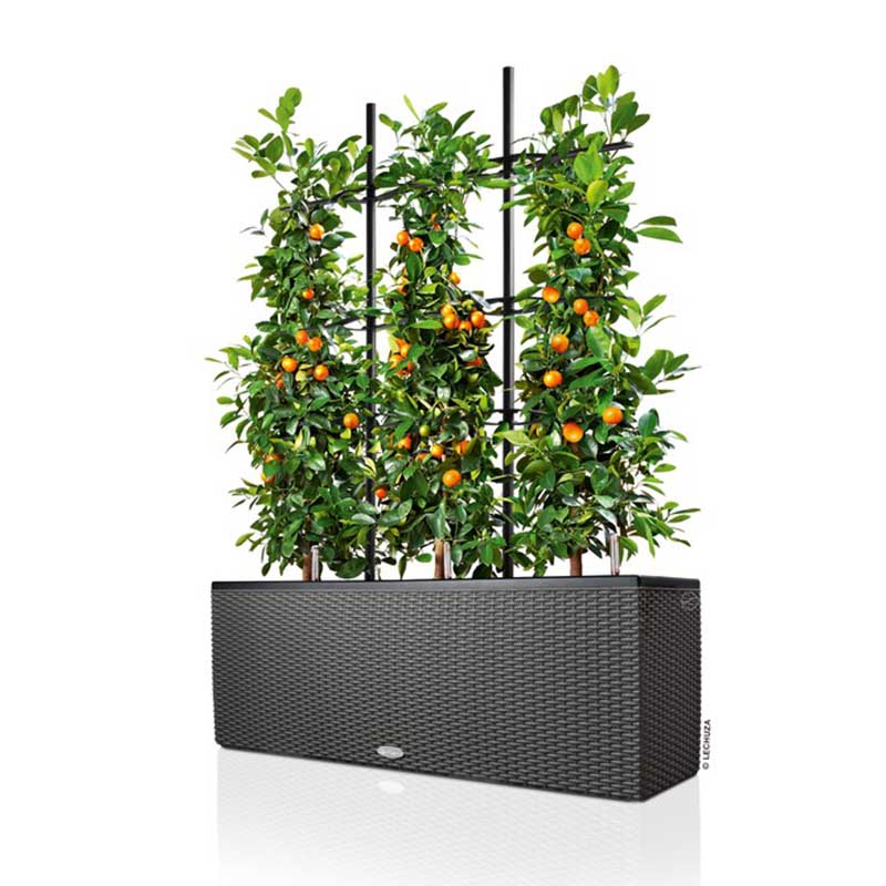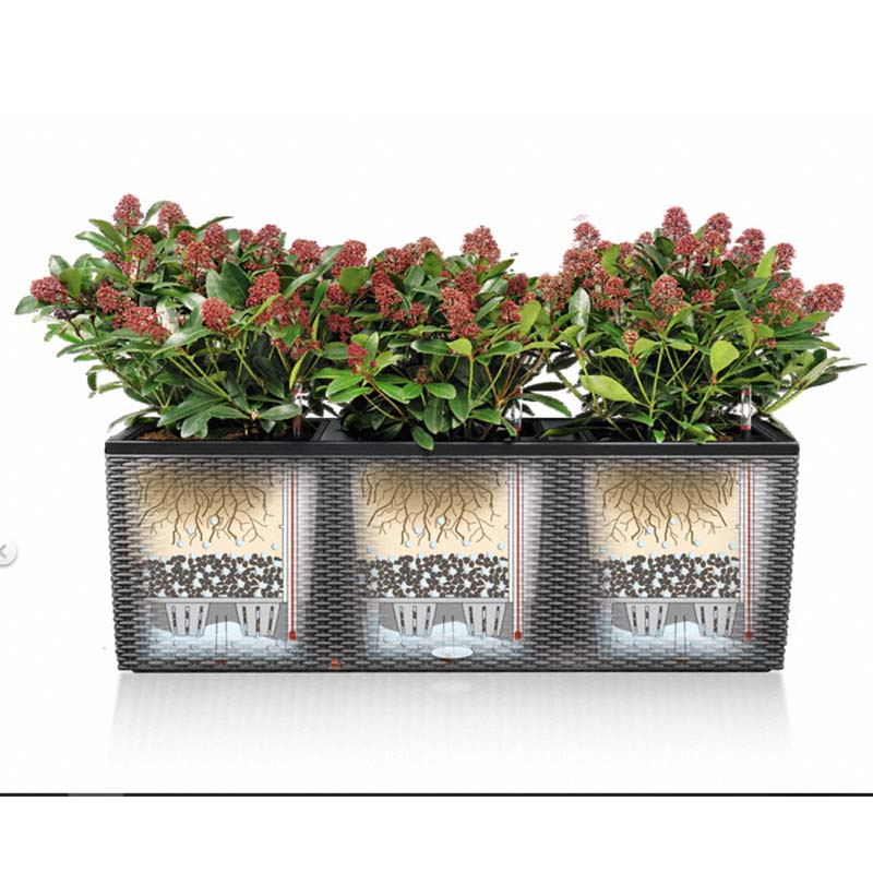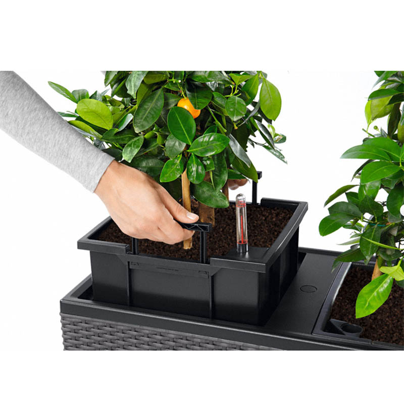 Επιδαπέδια ζαρντινιέρα με κορυφαία ποιότητα κατασκευής και μοναδικό σχεδιασμό σε ανθρακί rattan χρώμα. Η συσκευασία περιλαμβάνει την ζαρντινιέρα, 3 εσωτερικά δοχεία φύτευσης, 3 συστήματα αυτοποτισμού και 3 σακουλάκια lechuza pon. Απόλυτα εργονομική χάρη στις βυθιζόμενες λαβές (με δίπλωμα ευρεσιτεχνίας) που διαθέτει το κάθε δοχείο φύτευσης, προσφέρει τη δυνατότητα για εύκολη αλλαγή των δοχείων φύτευσης διευκολύνοντας την αλλαγή φυτών και λαχανικών, τη μεταφύτευση, το κλάδεμα των ριζών και το ξέπλυμα των φύλλων ενώ στη διαθέτει και 4 βαλβίδες αποστράγγισης (3 στις βάσεις των εσωτερικών δοχείων φύτευσης και 1 στη βάση της ζαρντινιέρας) για να απορρέει το πλεονάζον νερό όταν τοποθετείται σε εξωτερικό χώρο. Το σύστημα αυτοποτισμού λειτουργεί ευεργετικά για το φυτό καθώς του παρέχει την απαραίτητη ποσότητα νερού που χρειάζεται ενώ είναι εξίσου ωφέλιμο και για τον χρήστη καθώς τον απαλλάσσει από την καθημερινή ευθύνη φροντίδας του φυτού. Κάθε δοχείο φύτευσης έχει χωρητικότητα χώματος 31 λίτρα και χωρητικότητα νερού 7,5 λίτρα και προσφέρει ιδανικό περιβάλλον για την ανάπτυξη φυτών με ύψος έως 100cm και με ριζικό σύστημα έως 28cm. Πολυ ανθεκτική και ελαφριά κατασκευή (για τις δυνατότητες που προσφέρει), αντέχει στις μεταβολές της θερμοκρασίας και την υπεριώδη ακτινοβολία UV. Υπάρχει δυνατότητα τοποθέτησης ορθογώνιας βάσης LECHUZA.(Νο2 Μέγεθος) για ακόμη μεγαλύτερη ευστάθεια και ισορροπία ενώ το ειδικό πλέγμα αναρρίχησης LECHUZA (Νο2 Μέγεθος) δημιουργεί μια φανταστική πέργολα, ικανή να δημιουργήσει μοναδικές διακοσμητικές συνθέσεις και να κοσμήσει κάθε εξωτερικό χώρο.