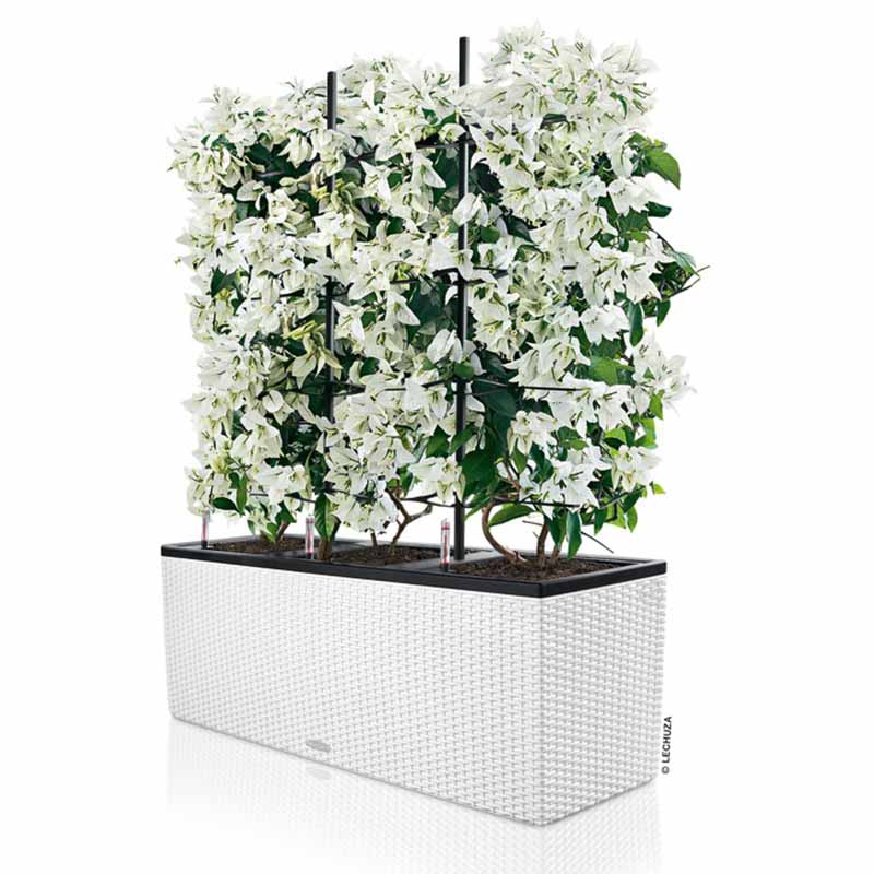 Επιδαπέδια ζαρντινιέρα με κορυφαία ποιότητα κατασκευής και μοναδικό σχεδιασμό σε λευκό rattan χρώμα. Η συσκευασία περιλαμβάνει την ζαρντινιέρα, 3 εσωτερικά δοχεία φύτευσης, 3 συστήματα αυτοποτισμού και 3 σακουλάκια lechuza pon. Απόλυτα εργονομική χάρη στις βυθιζόμενες λαβές (με δίπλωμα ευρεσιτεχνίας) που διαθέτει το κάθε δοχείο φύτευσης, προσφέρει τη δυνατότητα για εύκολη αλλαγή των δοχείων φύτευσης διευκολύνοντας την αλλαγή φυτών και λαχανικών, τη μεταφύτευση, το κλάδεμα των ριζών και το ξέπλυμα των φύλλων ενώ στη διαθέτει και 4 βαλβίδες αποστράγγισης (3 στις βάσεις των εσωτερικών δοχείων φύτευσης και 1 στη βάση της ζαρντινιέρας) για να απορρέει το πλεονάζον νερό όταν τοποθετείται σε εξωτερικό χώρο. Το σύστημα αυτοποτισμού λειτουργεί ευεργετικά για το φυτό καθώς του παρέχει την απαραίτητη ποσότητα νερού που χρειάζεται ενώ είναι εξίσου ωφέλιμο και για τον χρήστη καθώς τον απαλλάσσει από την καθημερινή ευθύνη φροντίδας του φυτού. Κάθε δοχείο φύτευσης έχει χωρητικότητα χώματος 31 λίτρα και χωρητικότητα νερού 7,5 λίτρα και προσφέρει ιδανικό περιβάλλον για την ανάπτυξη φυτών με ύψος έως 100cm και με ριζικό σύστημα έως 28cm. Πολυ ανθεκτική και ελαφριά κατασκευή (για τις δυνατότητες που προσφέρει), αντέχει στις μεταβολές της θερμοκρασίας και την υπεριώδη ακτινοβολία UV. Υπάρχει δυνατότητα τοποθέτησης ορθογώνιας βάσης LECHUZA.(Νο2 Μέγεθος) για ακόμη μεγαλύτερη ευστάθεια και ισορροπία ενώ το ειδικό πλέγμα αναρρίχησης LECHUZA (Νο2 Μέγεθος) δημιουργεί μια φανταστική πέργολα, ικανή να δημιουργήσει μοναδικές διακοσμητικές συνθέσεις και να κοσμήσει κάθε εξωτερικό χώρο.
