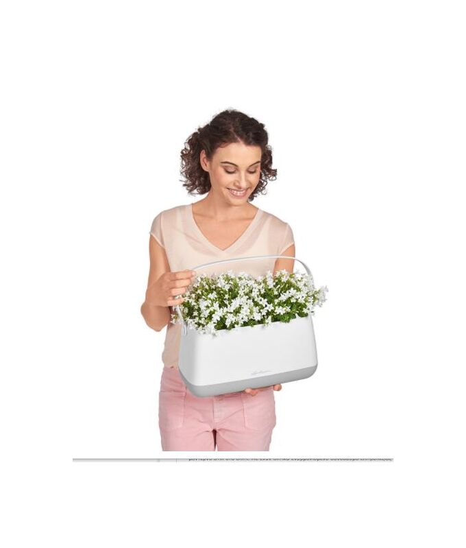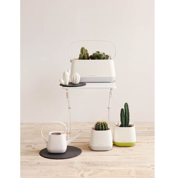 Επιτραπέζια ζαρντινιέρα-κασπώ με μοναδικό μοντέρνο σχεδιασμό και κορυφαία ποιότητα κατασκευής από ανθεκτικό πλαστικό στις πτώσεις, στις μεταβολές της θερμοκρασίας και την υπεριώδη ακτινοβολία UV. Η συσκευασία περιλαμβάνει τη ζαρντινιέρα-κασπώ, το σύστημα αυτοποτισμού με φιτίλι και την ενσωματωμένη χειρολαβή που διευκολύνει τη μεταφορά. Ιδανική για φύτευση βοτάνων στο σπίτι όπως βασιλικός, θυμάρι, δυόσμος, μαϊντανός κτλ καθώς απορροφούν την ιδανική ποσότητα νερού για να διατηρούν τη φρεσκάδα τους για μεγαλύτερο χρονικό διάστημα. Απόλυτα εργονομική καθώς δεν απαιτεί μεταφύτευση, τοποθετείται το φυτό μαζί με το γλαστράκι φύτευσης (όπως τα αγοράσατε) αφού πρώτα προσαρμοστεί το φιτίλι αυτοποτισμού στον πάτο του. Η γλάστρα είναι κατάλληλη να φιλοξενήσει τα τυπικά γλαστράκια διαμέτρου 14 εκατοστών, έχει χωρητικότητα νερού 0,9 λίτρων και προσφέρει ιδανικό περιβάλλον για την ανάπτυξη φυτών με ύψος έως 25 εκατοστά. Η γλάστρα LECHUZA YULA αποτελεί εξαιρετική επιλογή για τους λάτρεις του μοντέρνου style και για όσους θέλουν να προσθέσουν ''πράσινο'' στο εσωτερικό του σπιτιού, συνδυάζοντας αρμονικά υψηλή αισθητική και λειτουργικότητα.