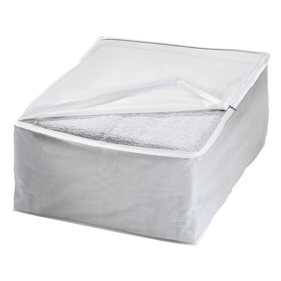 Θήκη φύλαξης ρούχων χωρητικότητας Ιταλικού σχεδιασμού, 72 λίτρων, κατασκευασμένο εξ'ολοκλήρου από PEVA. Διαθέτει περιμετρικό φερμουάρ για ευκολία στο άνοιγμα και μεγαλύτερη ασφάλεια στο κλείσιμο ενώ το λευκό διάφανο χρώμα επιτρέπει την οπτική επαφή με το περιεχόμενο. Χρήσιμο αξεσουάρ για κάθε υπνοδωμάτιο, μπορεί να φιλοξενήσει ρούχα, λευκά είδη, αξεσουάρ ένδυσης προστατεύοντάς τα από σκόνη και υγρασία. Οι διαστάσεις του επιτρέπουν να τοποθετηθεί κάτω από το κρεβάτι, εξοικονομώντας χώρο και χρόνο σε καθημερινή βάση.