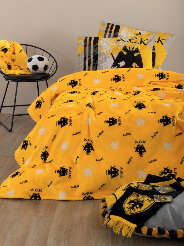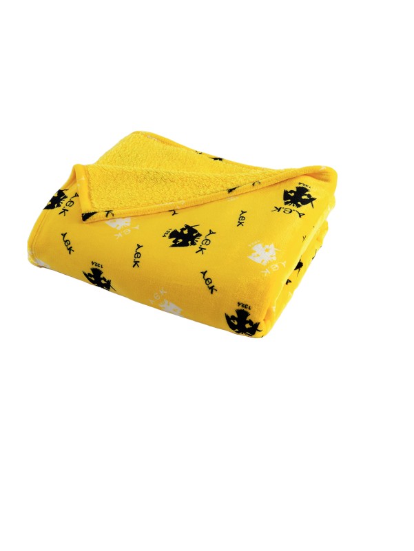 Κουβέρτα Ημίδιπλη 160x220 AEK BL διπλής όψης, από ύφασμα 100% flannel στη μία πλευρά, γούνα sherpa στην άλλη, αφράτη, μαλακή, ζεστή, ιδανική για το χειμώνα.