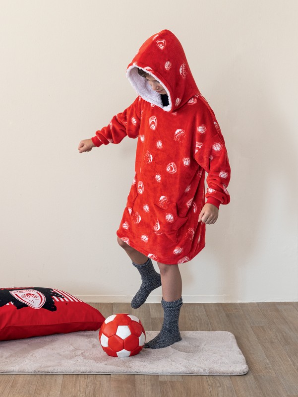 Κουβέρτα OLYMPIACOS με μανίκια και κουκούλα από 100% flannel fleece και γούνα sherpa για περισσότερη ζεστασιά. Ιδανική για το χειμώνα.