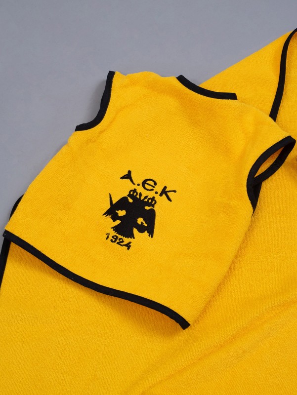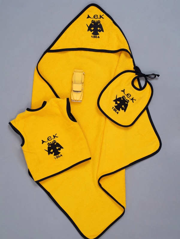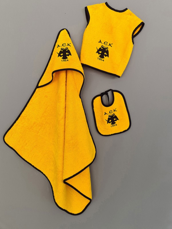 Σετ Λουτρου Βρεφικό Official Team Aek 1924 AEK BABY BLOCK από 100% βαμβάκι με κέντημα. Το σέτ λουτρού περιλαμβάνει ζιπουνάκι, ποδιά και πετσέτα με κουκούλα.