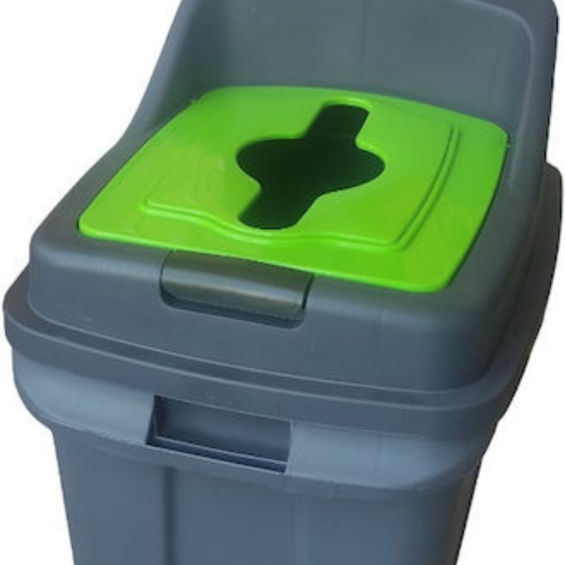 Κάδος απορριμμάτων-ανακύκλωσης 50lt με ειδικό άνοιγμα σε σχήμα «Η» για εύκολη ρίψη απορριμμάτων. Κατασκευασμένος από ανθεκτικό πλαστικό σε σκούρο γκρι χρώμα, με καπάκι σε πράσινη απόχρωση.