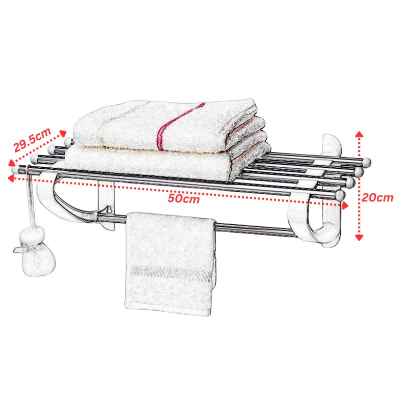 Ραφιέρα μπάνιου κατασκευασμένη από αλουμίνιο με πλαστικές λεπτομέρειες. Διαθέτει 4 επίπεδες βέργες αλουμινίου στο πάνω μέρος για τοποθέτηση πετσετών, ρούχων κ.α λευκών ειδών μπάνιου και βέργα αλουμινίου στο κάτω μέρος επιτρέποντας επίσης την τοποθέτηση πετσετών. Ιδανικό αξεσουάρ για κάθε μπάνιο, οικιακό ή επαγγελματικό (ξενοδοχεία, ενοικιαζόμενα δωμάτια κλ.π.). Τοποθετείται στον τοίχο με βίδες.
