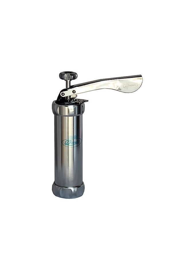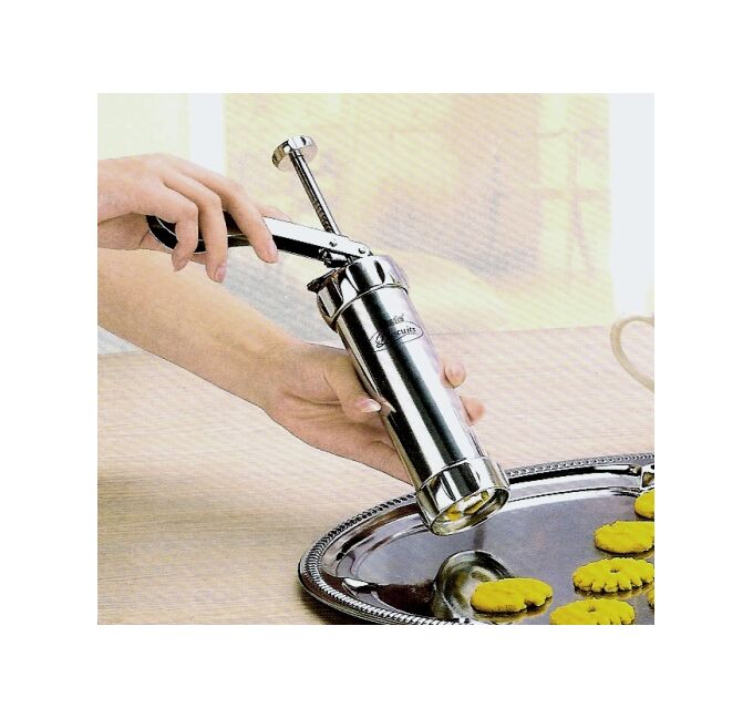 Μεταλλική μπισκοτομηχανή κατασκευασμένη από αλουμίνιο, η οποία περιλαμβάνει 20 διαφορετικές κεφαλές παραγωγής μπισκότων παρέχοντας πληθώρα σχημάτων. Έχει δύο σκάλες, μία για λεπτά και μία για πιο χοντρά μπισκότα. Επιπλέον το πακέτο περιλαμβάνει 4 μύτες που σας επιτρέπουν να χρησιμοποιήσετε την μηχανή ως κορνέ για σαντιγί ή γαρνίρισμα ή και για να φτιάξετε κουλούρια. Η μεταλλική κατασκευή της δίνει μεγάλη διάρκεια ζωής και μεγαλύτερη ευκολία στο καθάρισμα. Ιδανική για μπισκότα, κουλούρια, χρήση σαντιγί αλλά και για όποιο μείγμα θέλετε να του δώσετε σχήμα.