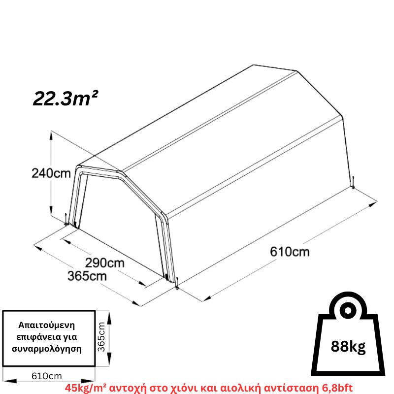 Διαθέτει 1 πόρτα διαστάσεων 285X190cm η οποία κλείνει με διπλό φερμουάρ, επικλινή σκεπή που εξασφαλίζει την απορροή των ομβρίων υδάτων, ενώ υπάρχει δυνατότητα να γίνει διαμπερής με αφαίρεση του πίσω πάνελ. Περιλαμβάνονται επίσης σετ αγκυρίων στήριξης για την ενίσχυση της αποθήκης στα υψηλά μποφόρ και ιμάντες με καστάνια για τέντωμα του υφάσματος. Έχει 45kg/m² αντοχή στο χιόνι και αιολική αντίσταση 6,8bft.