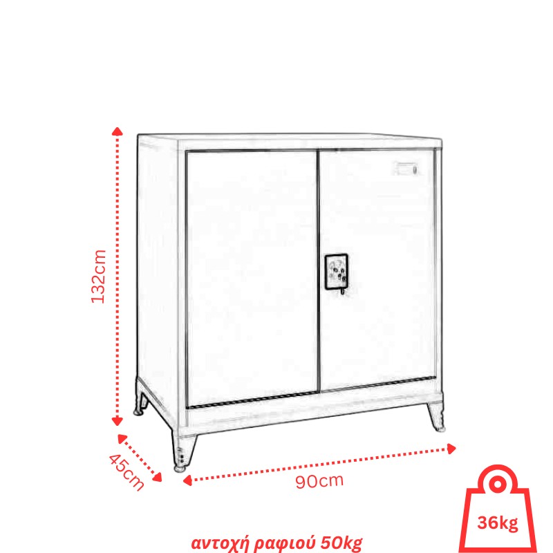 Δίφυλλη μεταλλική ντουλάπα κατασκευασμένη από γαλβανιζέ χάλυβα πάχους 0,6mm (πόρτες/πλευρές/οροφή) και 0,8mm (πάτωμα), βαμμένη με ειδική ηλεκτροστατική βαφή για maximum αντοχές στις καιρικές συνθήκες και τις διαβρώσεις. Διαθέτει 3 μεταλλικά ράφια που ορίζουν 4 αποθηκευτικούς χώρους, πάτωμα με πλευρική και κεντρική ενίσχυση, μεταλλικούς μεντεσέδες και γαλβανιζέ πίρους σε μη εμφανή σημεία. Διαθέτει κλειδαριά ασφαλείας που δεν προεξέχει, και ρυθμιζόμενα πόδια για μεγαλύτερη ευστάθεια. Τα εσωτερικά ράφια τοποθετούνται πάνω σε κλιπς ώστε να μπορούν να αντικατασταθούν εύκολα και να τοποθετηθούν στο επιθυμητό ύψος καθιστώντας την με τον τρόπο αυτό, ιδανική παπουτσοθήκη ενώ υπάρχει δυνατότητα τοποθέτησης περισσότερων ραφιών. Μεγάλο πλεονέκτημά της είναι ότι δεν παραδίδεται συναρμολογημένη, αλλά σε μορφή επίπεδων πακέτων, ώστε να καταλαμβάνει τον ελάχιστο δυνατό όγκο και να μεταφέρεται με τον πιο εύκολο και οικονομικό τρόπο. Η συναρμολόγηση γίνεται εύκολα και γρήγορα χωρίς να χρειάζονται ειδικές τεχνικές γνώσεις. Είναι κατάλληλη τόσο για εσωτερικούς όσο και για εξωτερικούς στεγασμένους χώρους.